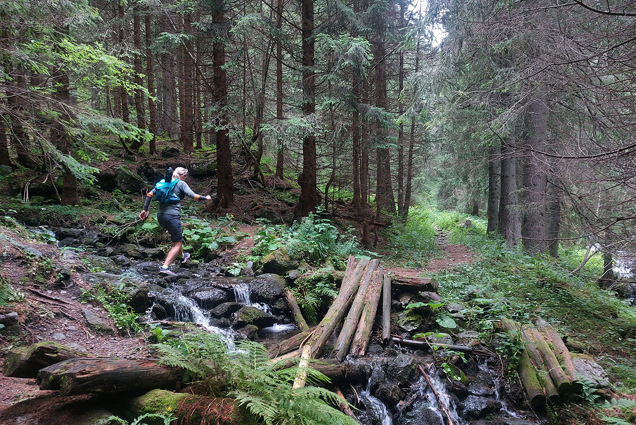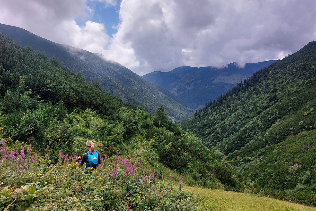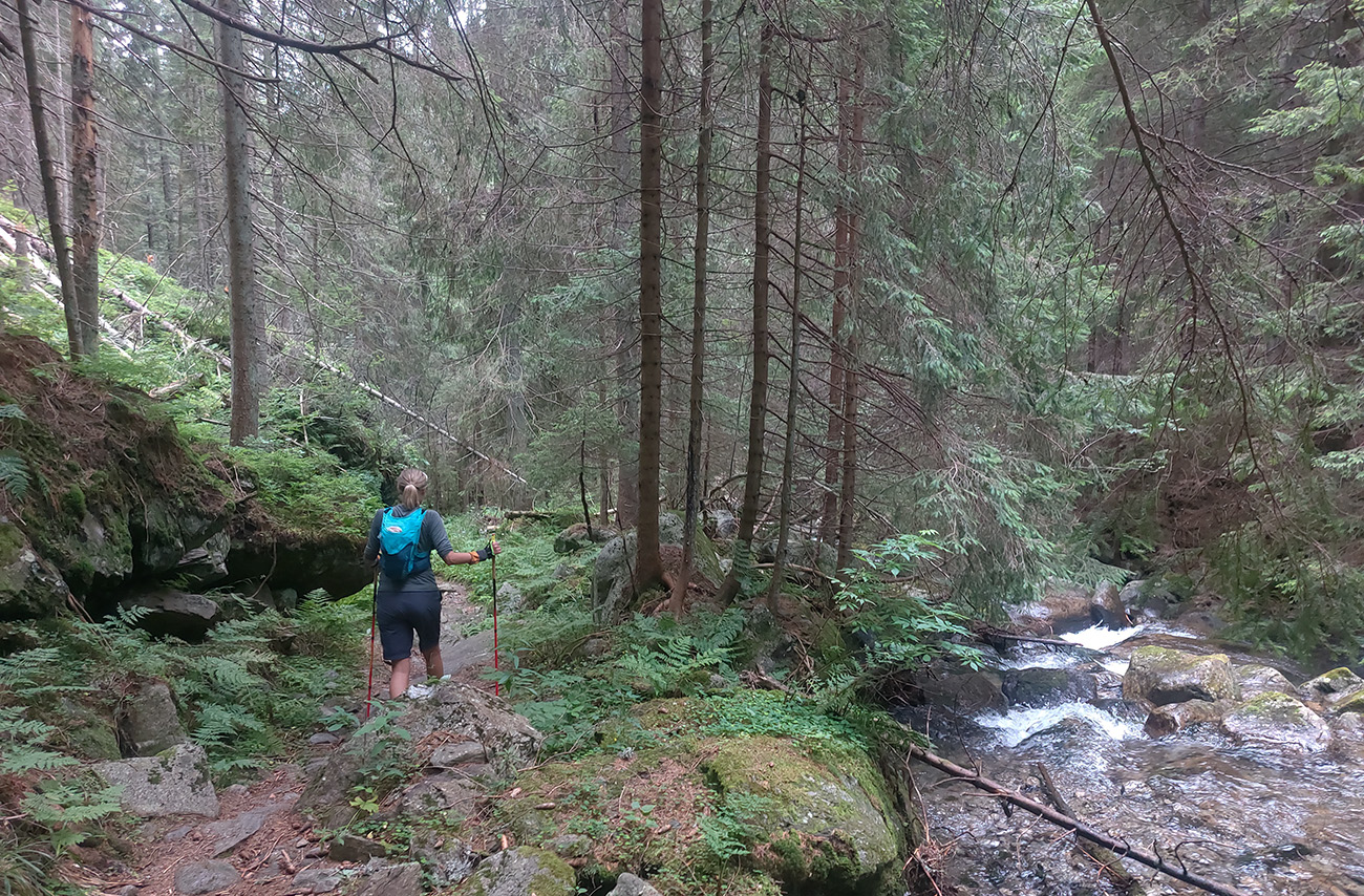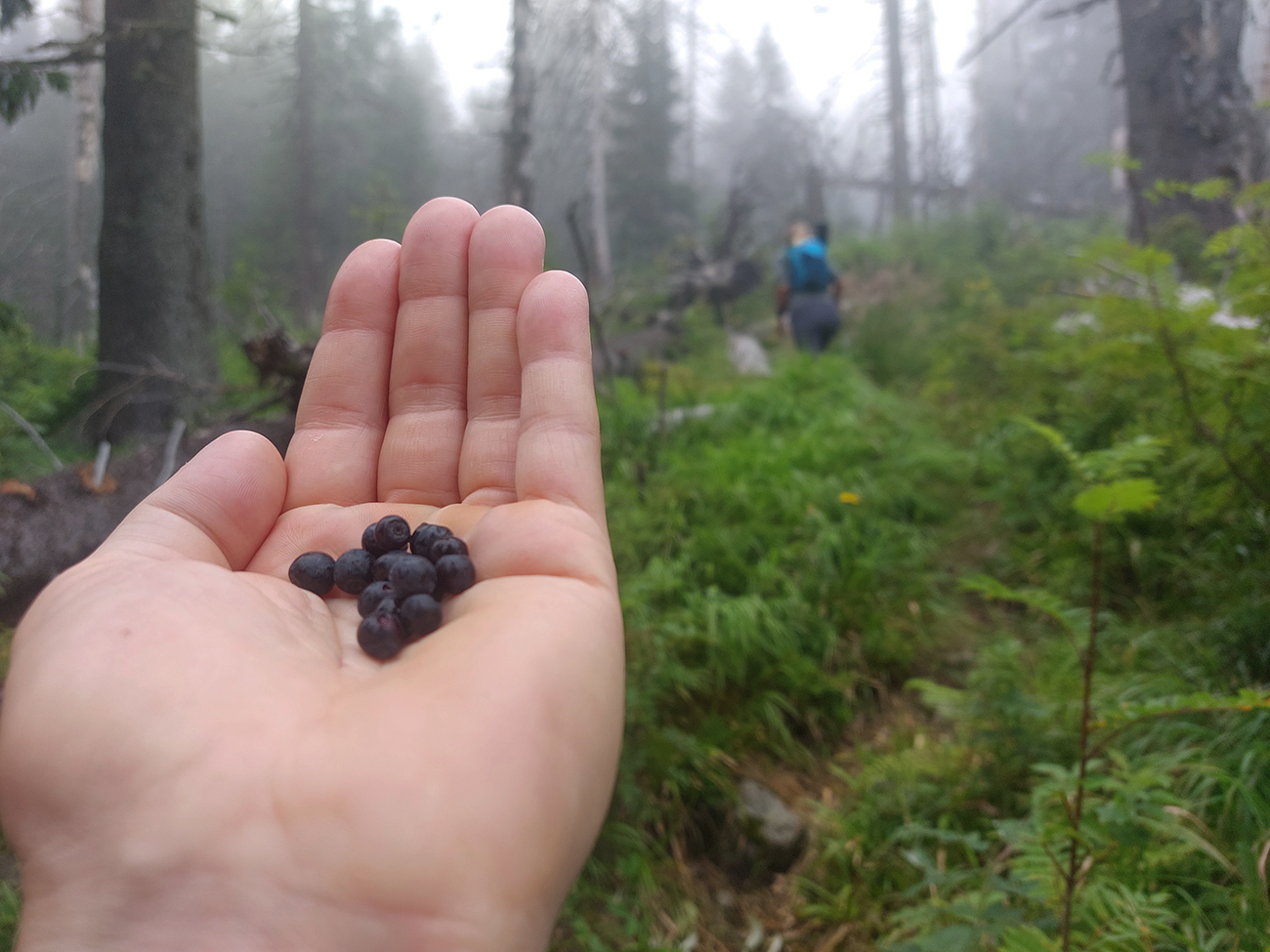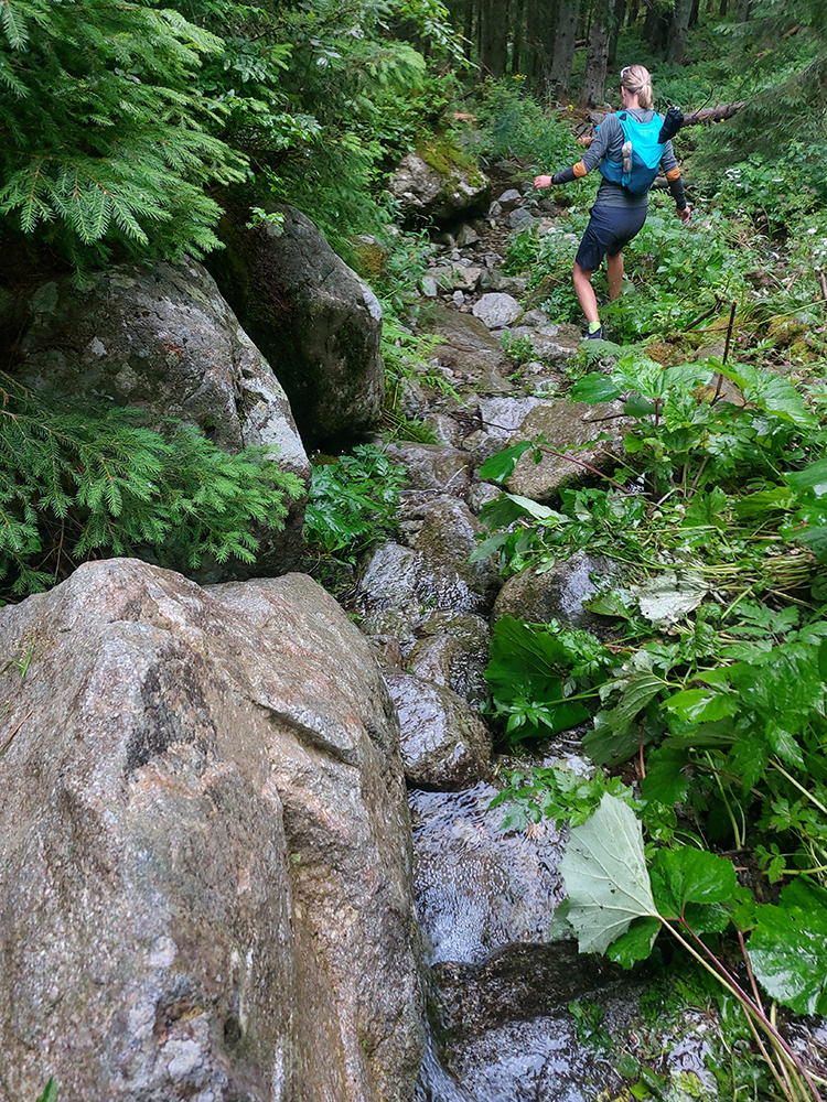 Nástup do Hlbokej vedie vysoko :-) Lebo tentokrát nie popri potoku, ale hneď od rázcestia strmo hore, do svahu nad dolinou. Potom znovu kalamitisko, teda aj čučoriedkové hody. Onedlho von z lesa do kosodreviny a zase bližšie ku potoku, cez ktorý treba občas preskočiť. Aj cez početné prameniská.
