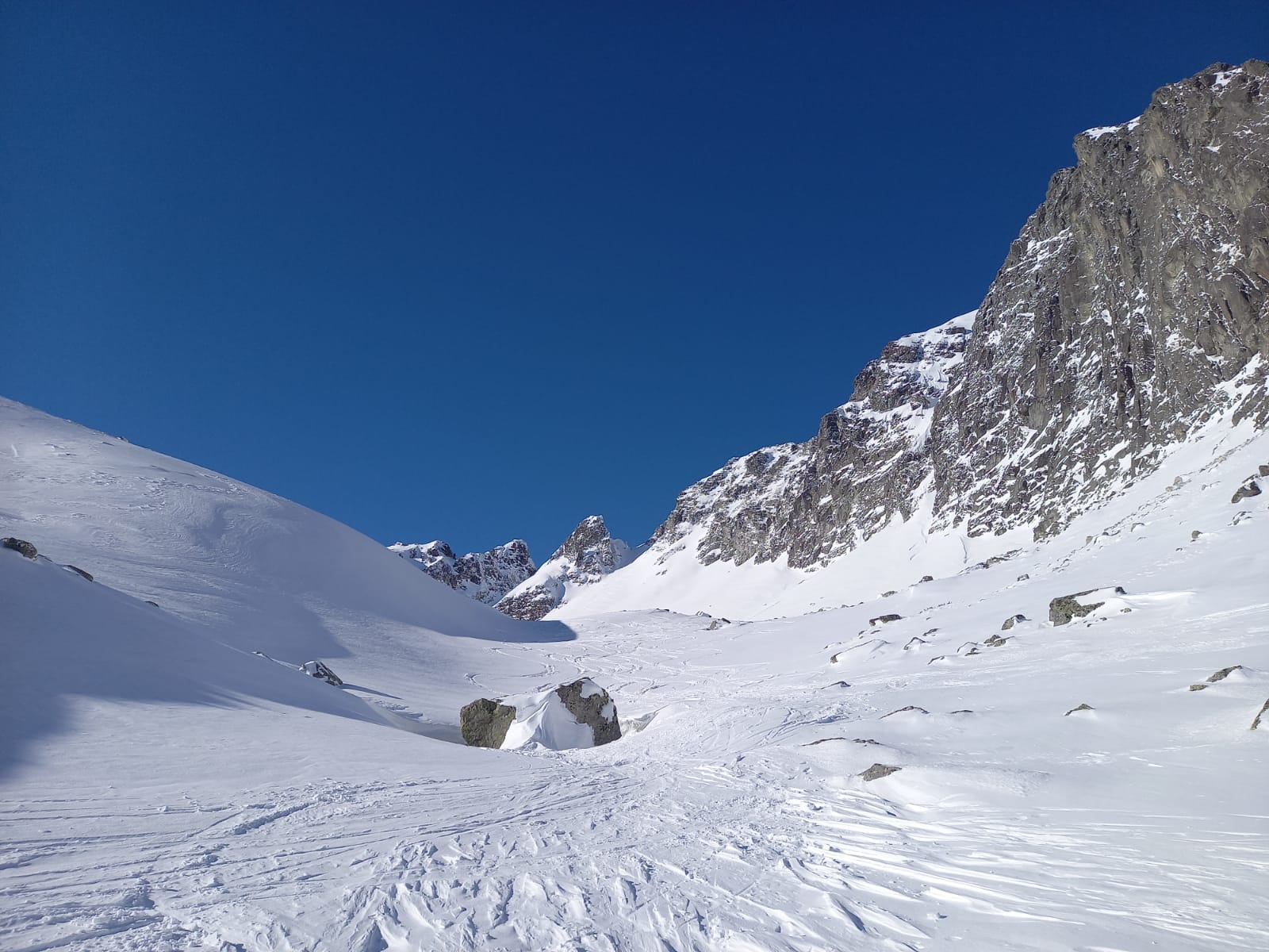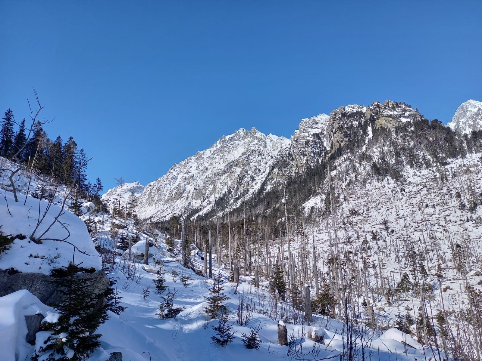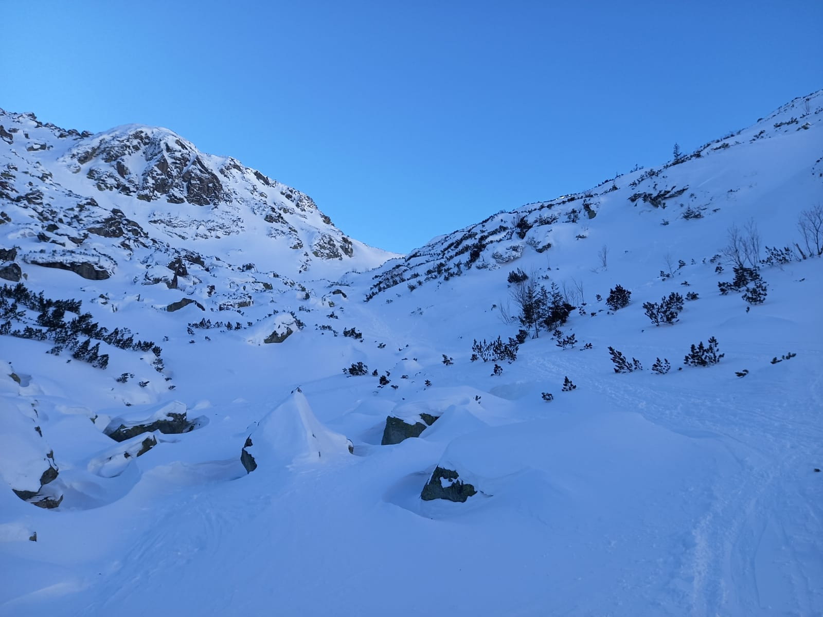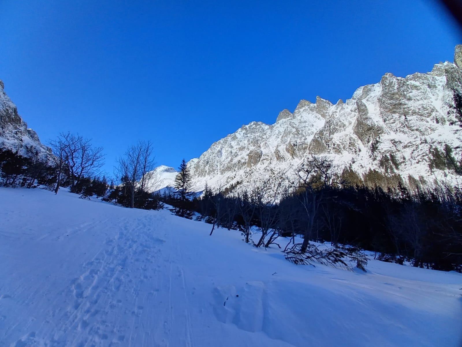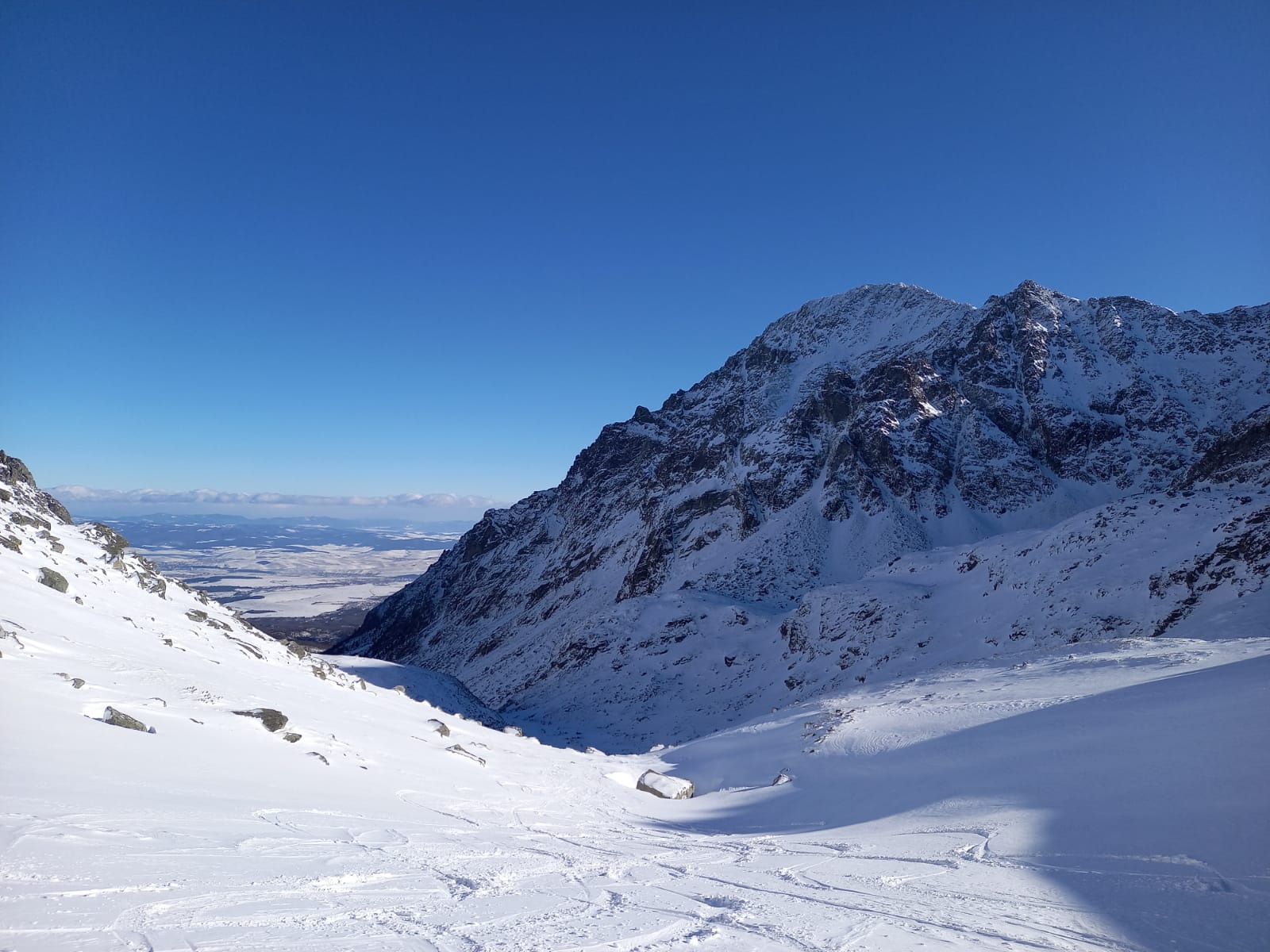 Šlapať sa dá bez problémov zo Smokovca. Dobrou variantou je stará zjazdovka po ľavej strane pozemnej lanovky. Z Hrebienka magistrála tiež vysnežená. Húpačky a chodník v doline silne vyfúkané a miestami ľadové. V doline ešte chýba sneh ale s trochou opatrnosti sa dá bez škrabancov. Nad Bránou už snehu pribúda a v Generáli a v Závrati podmienky celkom dobré. V ľavej strane Závraťu stopy po vypadnutej lavíne (asi včera). Stopa prešlapaná až hore ale dnes tu lyžovalo iba pár ľudí.