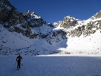 prebehol bez problému. Obúvam mačky a v dobrej stope šlapem hore. Na druhej strane ma čaká posledný problém dnešného dňa. Traverzovanie natopeného lavinózneho svahu. Dopadne to všetko ok a nalepujem pásy kúsok nad Kačacím plesom. Celkom sranda čo tie Gecká vydržia...