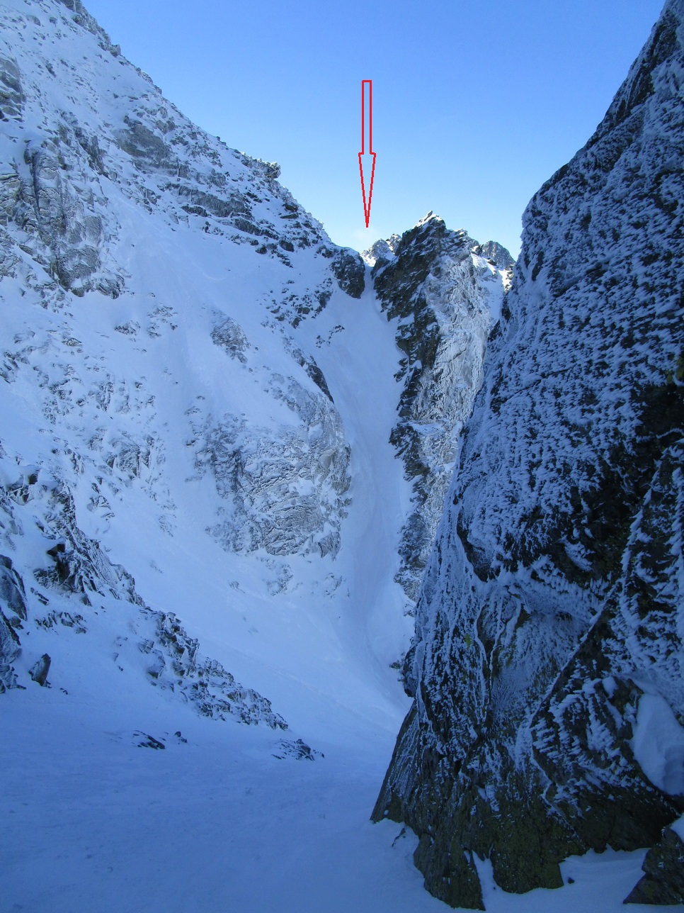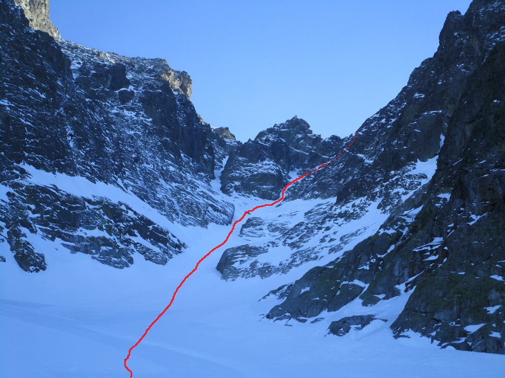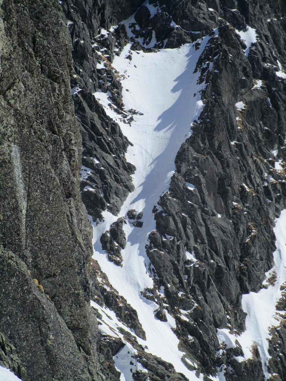 Super stopa pod bránkou, dnes už viem že to bola partia Roba Gálfyho ktorá tu deň predo mnou dala tiež parádny okruh. V hornej časti už je komín bez snehu. Nebyť fixu bolo by to slušné lezenie. Problém je ale, že fix je predratý viac ako do polovice. Prichytávam sa ho úplne jemne a snažím sa neťahať. Zliezanie na druhú stranu už mám nacvičené a o chvíľu šlapem ku