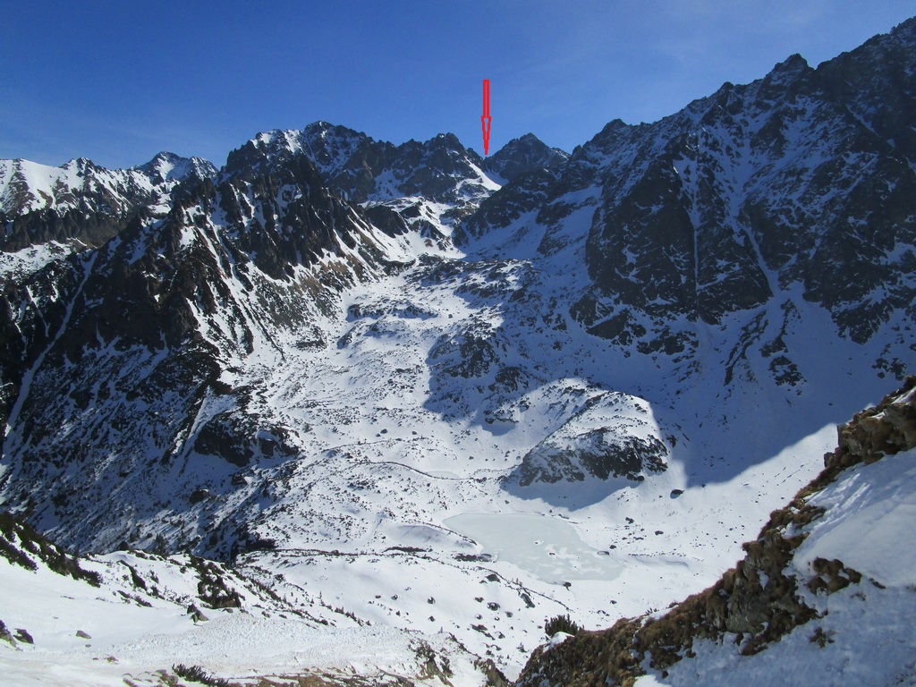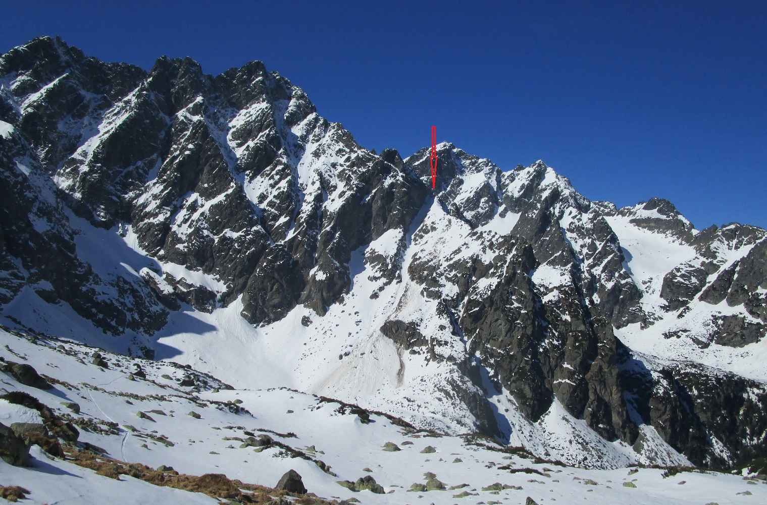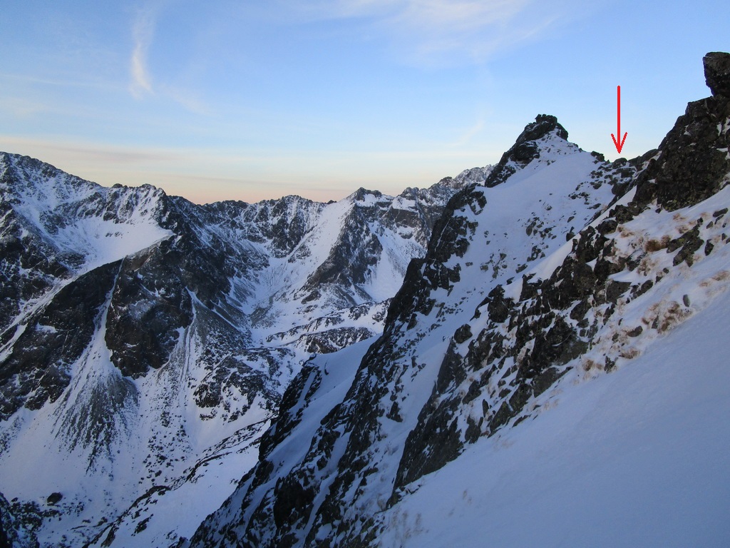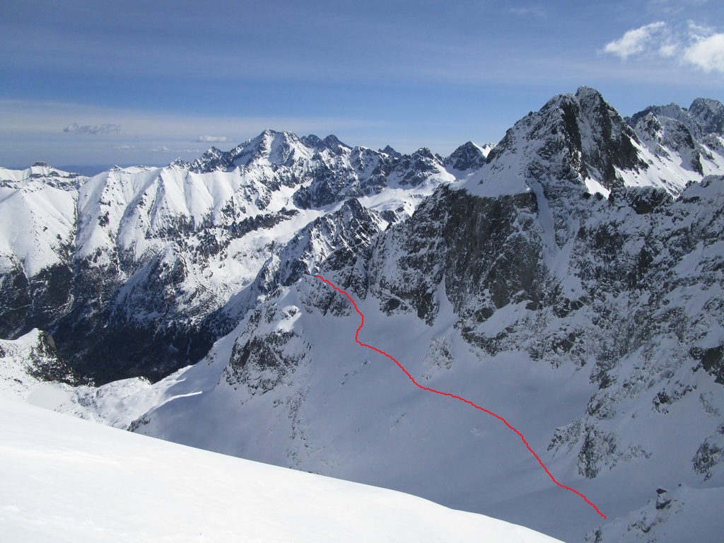 Super stopa pod bránkou, dnes už viem že to bola partia Roba Gálfyho ktorá tu deň predo mnou dala tiež parádny okruh. V hornej časti už je komín bez snehu. Nebyť fixu bolo by to slušné lezenie. Problém je ale, že fix je predratý viac ako do polovice. Prichytávam sa ho úplne jemne a snažím sa neťahať. Zliezanie na druhú stranu už mám nacvičené a o chvíľu šlapem ku