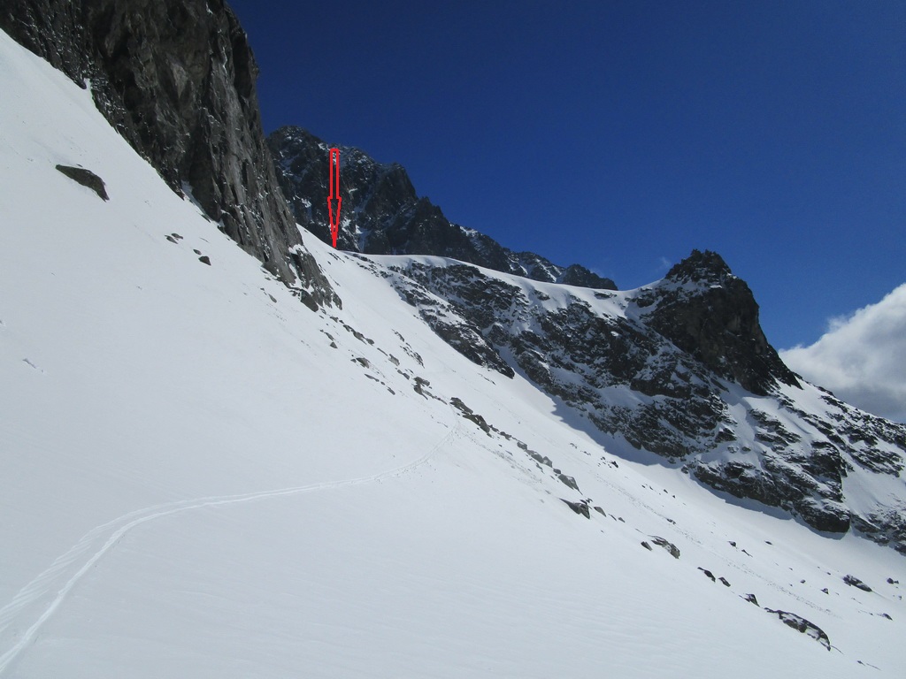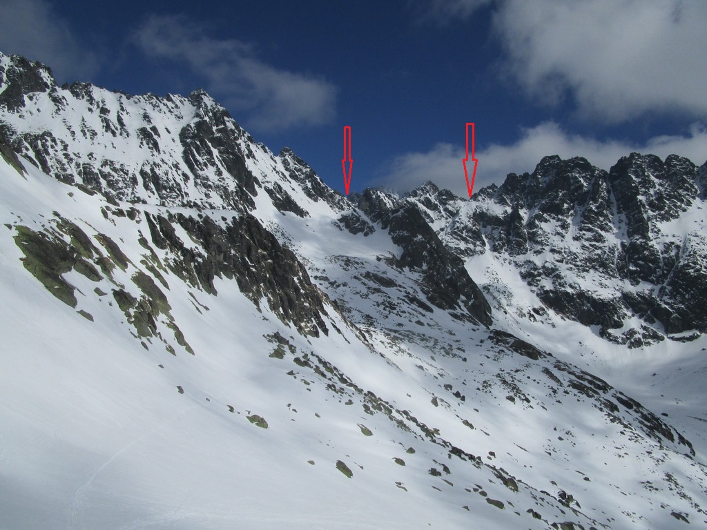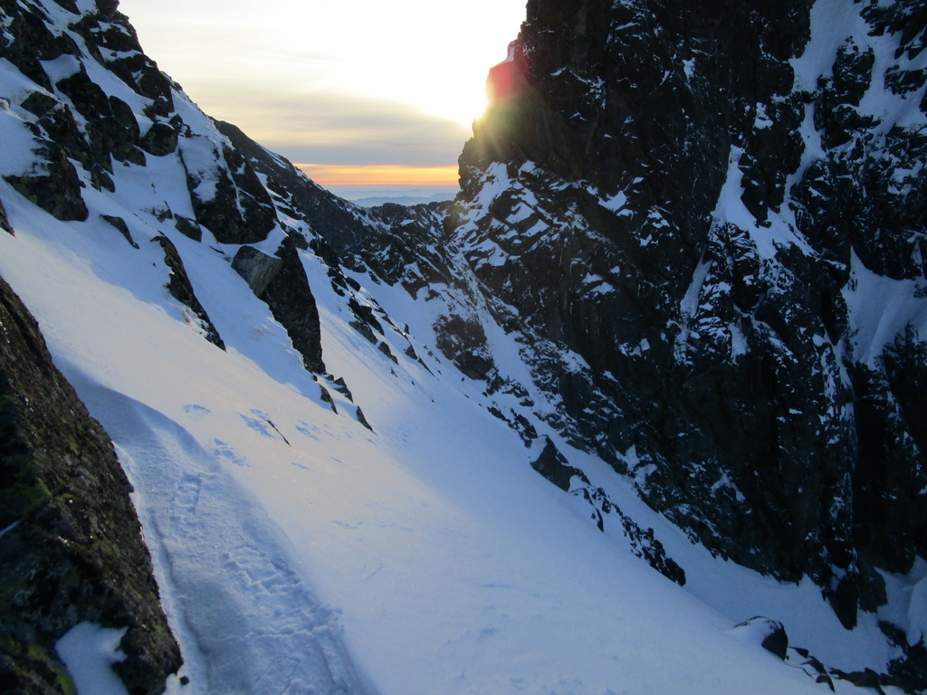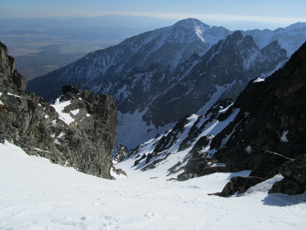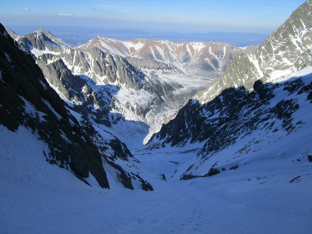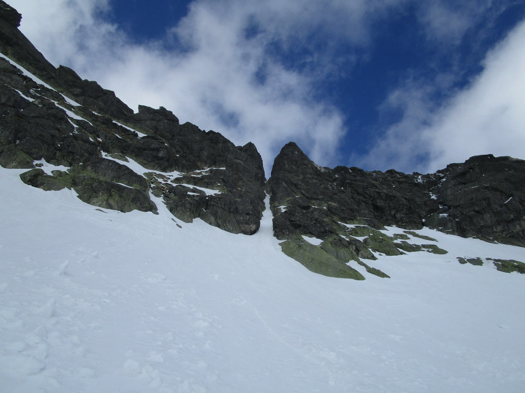 Zjazd z Batizovského je parádny firn. Už bolo načase sa nejako odmeniť. Namiesto vychutnávania si oblúčikov po dokonale rovnom svahu sa ale snažím traverzovať maximálne vysoko aby som ušetril každý možný meter. Do sedla vychádzam na mačkách a rovno začínam zostupovať na druhú stranu. V zostupovom žľabe sú našťastie dobré stopy tak postupujem rýchlo až kým sa nedostanem ku vodnému ľadu v spodnej časti. V piatok som tu delikátne zliezal ale teraz pozerám že niekto tu vysekal parádne stupy. Dík.