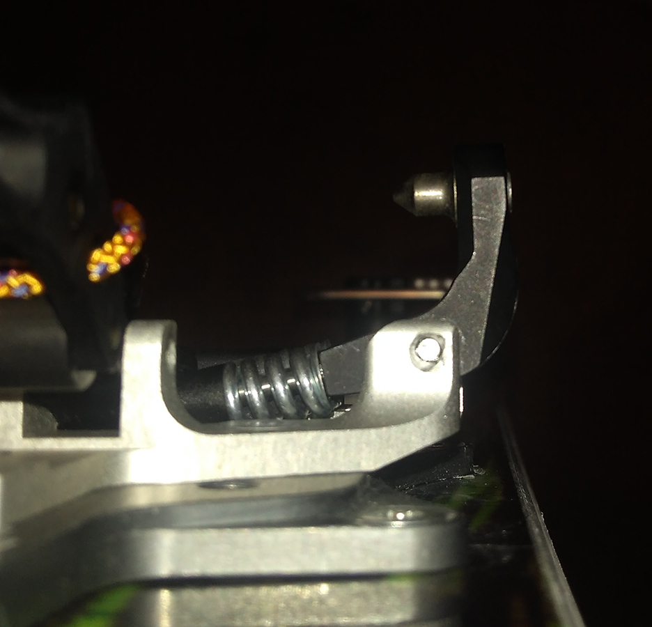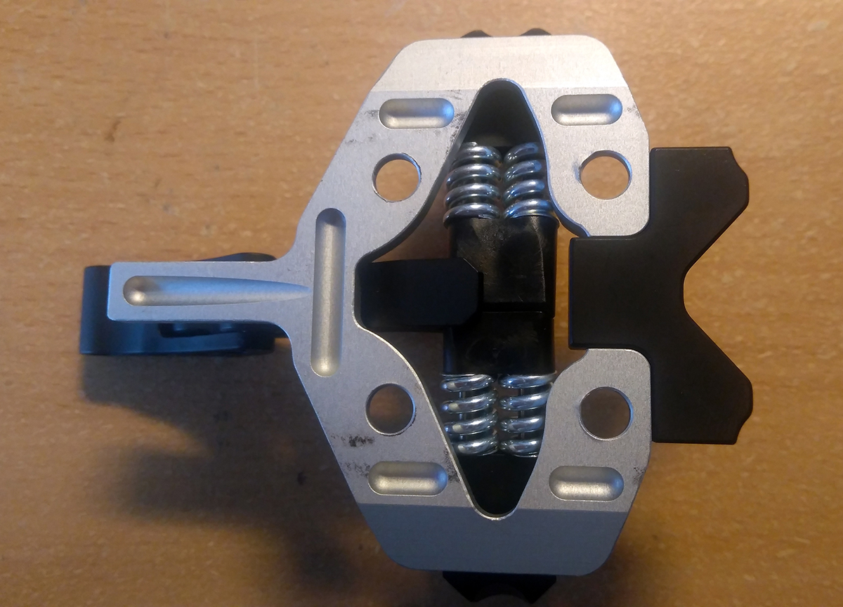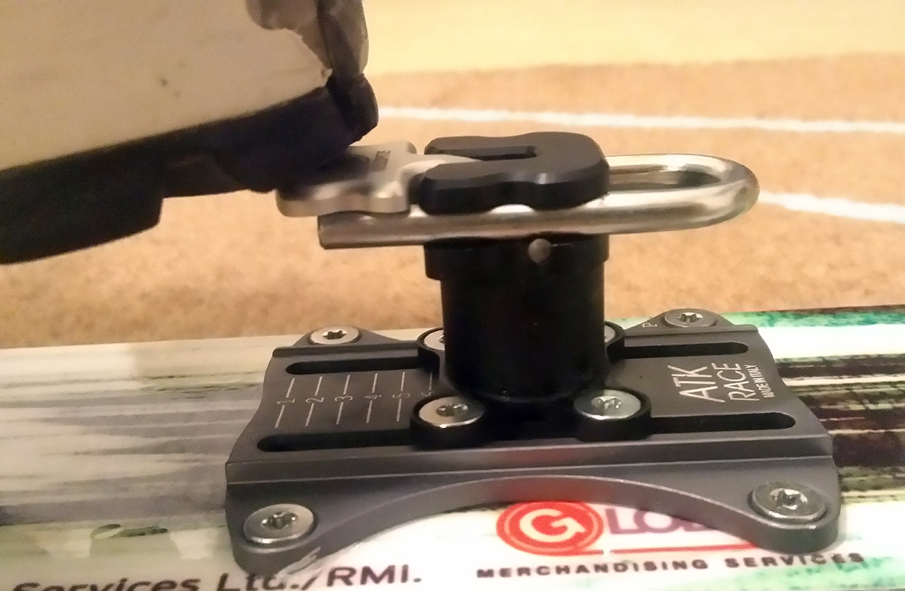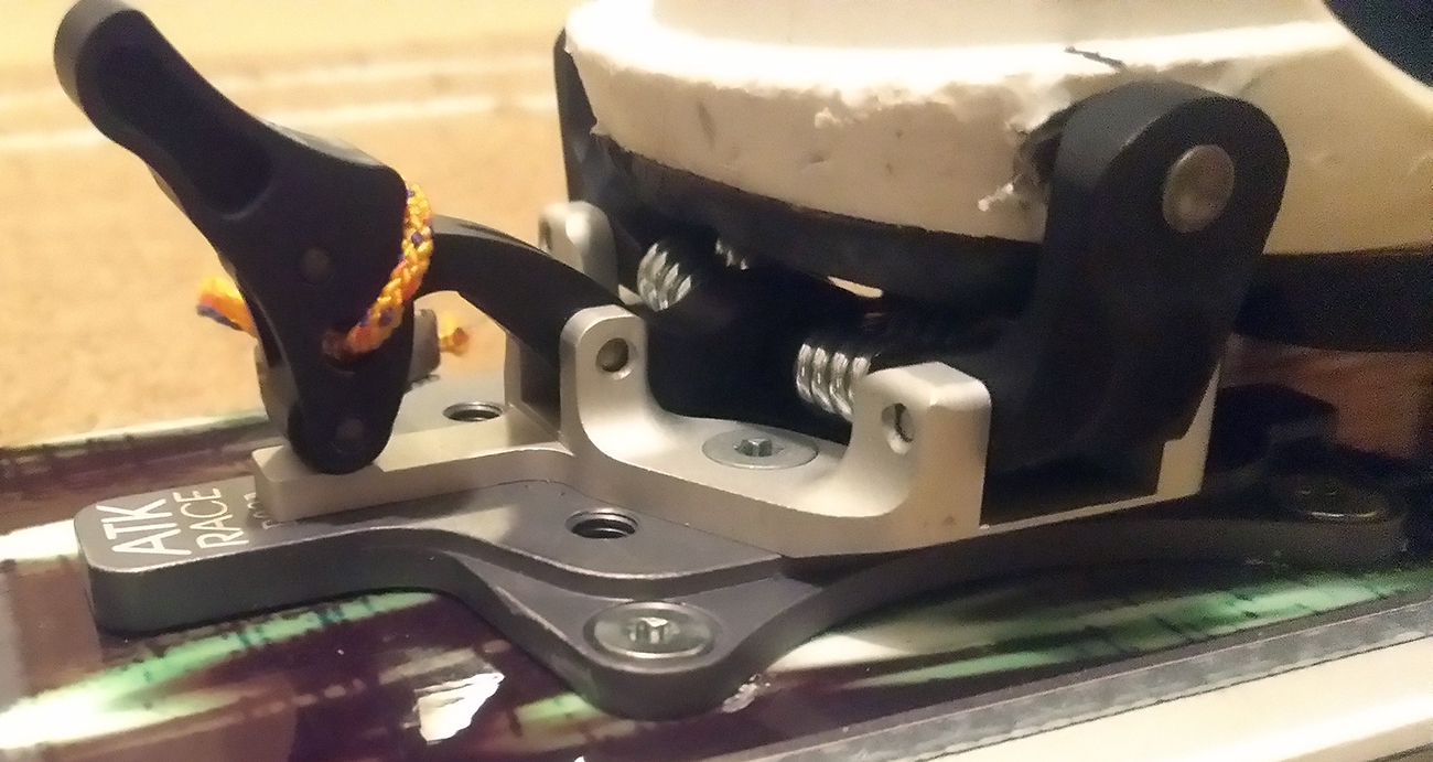 Plocha podstavy špičky má na šírku iba 5.2 cm, čo prekvapivo umožnilo použiť aj staršiu verziu rozširovacej položky pre XXL lyže, konkrétne podložku ATK R03 A a P, ktorá má šírku 5.1 cm (novšia ATK R08A už má šírku 6 cm). Ramená prednej časti (s čeľusťami) teda v podstate visia vo vzduchu a spoliehajú sa na pevnosť v ohybe 4-5 mm hrubej, no umne tvarovanej a hojne frézovanej hliníkovej zliatiny. Staré dobré TLT-čko to zvládalo s 2mm hrúbky ťahanej ocele, ale na plastovej podložke 6 cm širokej. Tu vidno, resp. je možné si domyslieť dizajn a pevnostné charakteristiky, ktoré musí viazanie ako celok spĺňať, aby všetko fungovalo ako má, ideálne aj viac rokov a ešte aj s bezpečnostnými rezervami.