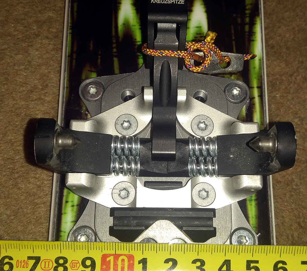 Kým ostatní výrobcovia to obvykle fixujú dvoma skrutkami, Kreuzspitze na to išlo polopate. Pri montáži založiť, dotlačiť, priskrutkovať viazanie a hotovo. Trime ako hluchý dvere. Žiadne skrutky navyše, žiadne strhnuté závity, strihnuté skrutky. Ak sa tento úchyt aj vylomí (stať sa môže kadečo), dá sa nahradiť pomerne ľahko, je síce potrebné odmontovať špičku viazania z lyže (alebo podložky) ale netreba sa babrať s problémovými skrutkami a pod.