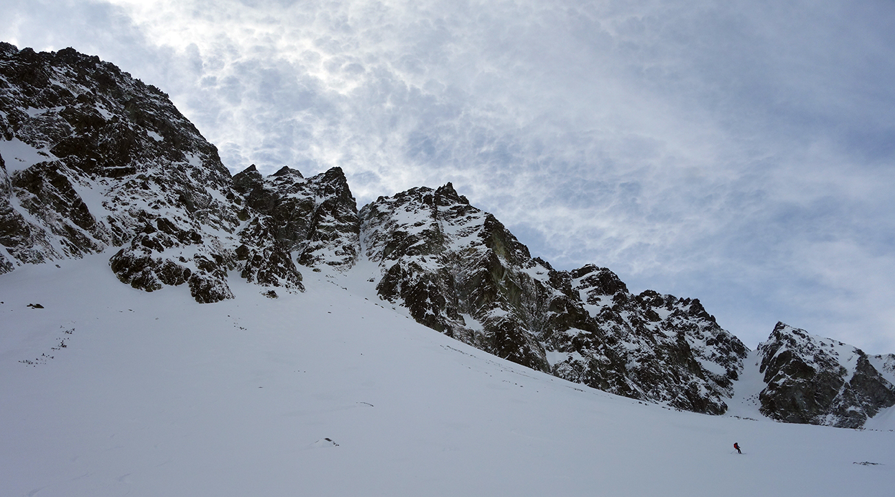 Jasnou voľbou na druhý výšľap sa stáva Hlinské sedlo. Pod vplyvom adrenalínu z parádnej jazdy prvýkrát a naposledy ťahám stopu, a aj to len do polovice žľabu. Meníme lyže za mačky a v horšiacom sa počasí prichádzame do Hlinského sedla. Pochopiteľne sa nezdržujeme a valíme dole. Sklon žľabu z Hlinského sedla je o niečo poctivejší, ale kvalita snehu je stále veľmi dobrá. Po chvíli sme na dne Satanej dolinky. Ja som tiež na dne, no stará garda je nekompromisná a diktuje šliapať do Satanovho žľabu. Lepšie, ako ich dve hodiny čakať pri pive, sa mi nakoniec zdá vyraziť spolu s nimi. Fúka, sneží a ja nevládzem. Robo však tvrdí, že sa vyčasí, čo sa mi veru nechce veriť. Akosi automaticky nahadzujem pásy a odkrajujem prvé metre úvodným širokým kužeľom. Postupne naberáme výšku a počasie sa na moje prekvapenie vylepšuje. Predpoveď a Robo neklamali. Zlepšenie počasia je vítanou motiváciou. Peťovi s Robom sa darí ťahať stopu prekvapivo vysoko. Nového snehu nie je málo, trochu upokojuje, že pred nami si už jazdu vychutnali dvaja skialpinisti. Vo vrchnej tretine žľabu, kde to už na lyžiach ďalej nejde, už som celkom na kašu a bágrovať sa žľabom po gule vynechávam. Tam, kde si staré pušky dajú lyže na batoh, ja zamieňam do zjazdového módu a ešte ich pri otrockom záverečnom výšľape pozorujem. Dochystám sa na zjazd, chalani mi zmiznú v esovitom žľabe a ja zapúšťam v zhutnenom prašane prvé oblúky. Zamierim ku skale mimo spádnice žľabu a čakám na parťákov. Už spoločne si vychutnávame rozširujúci sa kužeľ pod Satanom, stále vo výbornom snehu. Dojazd bez vyzutia plynule až k hotelu a nádherný deň v milovanej doline za nami.