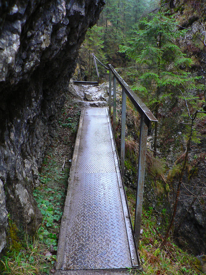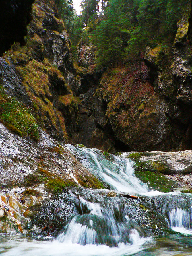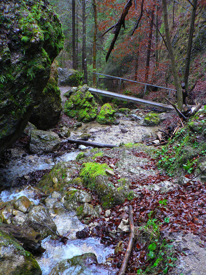 Počasie na mikulášsku sobotu vyšlo takmer ideálne hnusné: s občasným dažďom a hrebeňmi hôr v mrakoch, so zdrapmi hmiel v dolinách a s teplotou málo nad nulou. Aspoň že nefúkalo. Ale v tiesňavách pod Rozsutcom je pekne, aj keď je škaredo :-) Navyše v takomto počasí tam človek nestretne ani nohu, čo je vzácna príležitosť vychutnať si prírodu bez uhýbania, posúvania v rade - a najmä v tichu. A pre niekoho aj príležitosť zaexperimentovať si v pokoji so samospúšťou a manuálnym nastavením expozície pri fotení. Dosť užitočné pri slabom svetle, aké v „Dierach“ väčšinou panuje - a v decembrovom šere zvlášť :-) Takže som začal z Bieleho potoka od hotela, s plánom užiť si a presnoriť všetky tiesňavy. Na začiatok som prešiel po modrej Dolnými dierami na Podžiar a zišiel som nazad, ale už len k rázcestiu Ostrvné. To bola dobrá rozcvička s malým stúpaním, atraktívnymi úzkymi kaňonmi a keď tam nikoho niet, nie je problém prejsť to v oboch smeroch. V lete sú práve tu najväčšie „zápchy“, lebo ľudia chodia húfne z Bieleho potoka aj z opačnej strany, zo Štefanovej.