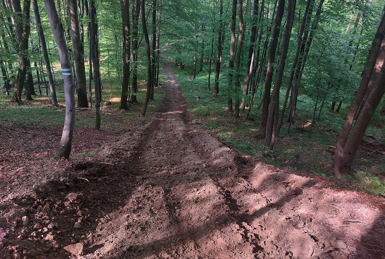 Za sedlom Dujava znovu nejako viacej lúk. Pekné rozhľady, ale cesty niet a tráva vysoká, pre istotu zapínam gps. Sklony sa zmierňujú, ale aj cesta sa zužuje do chodníka a tunel sa často uzatvára konármi a krovím. Okolo sedla Zajačí vrch to pod nohami niekde aj čvachtá, niekde treba aj kľučkovať, v početných koľajach stojí voda. Zrazu čo to, halucinácia? Nie, to len hraničiar na koni ide oproti. Nechápem, ako sa tade dokáže predierať a ako sa niekde zohýna. Za ním dokonca bikepacker tlačí svoj naložený stroj. Tak tomu závidím ešte menej. Pred Polianskym sedlom je lesný priesek na dlhšiu chvíľu naopak zase široký, navyše takmer rovný a bez prevýšenia, kluskanie až taká rozkošššš!