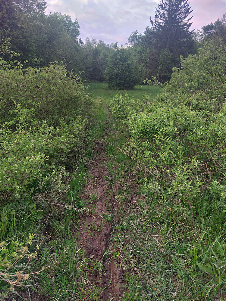 A hneď začína mordor. Rozbehnúť sa skoro nedá, stále treba kľučkovať, obchádzať, zohýnať sa... Našťastie chodníčky vyšliapané a ako pozorujem, hlava prestala protestovať a telo tiež nejako ožilo. Žiadna spánková kríza, toto treba využiť a fičať čo to dá, lebo útlm raz príde. Tak nech ho chytím na príjemnejšom úseku. Ten prichádza (zatiaľ bez krízy) niekde za Čertižským sedlom, kde je hraničný priesek znovu normálne priechodný. Predtým som ešte na lúkach dokonale zo seba opral všetko blato, až po kolená. Lebo Aladin hlásil na piatkový večer poriadne lejaky v okolí Medzilaboriec a podľa mokrého podkladu, po chodníkoch tečúcich potôčikov a totálne premočenej trávy mi došlo, že mu to asi vyšlo. Každopádne chodidlá zatiaľ úplne v pohode (asi aj vďaka skvelým topánkam).