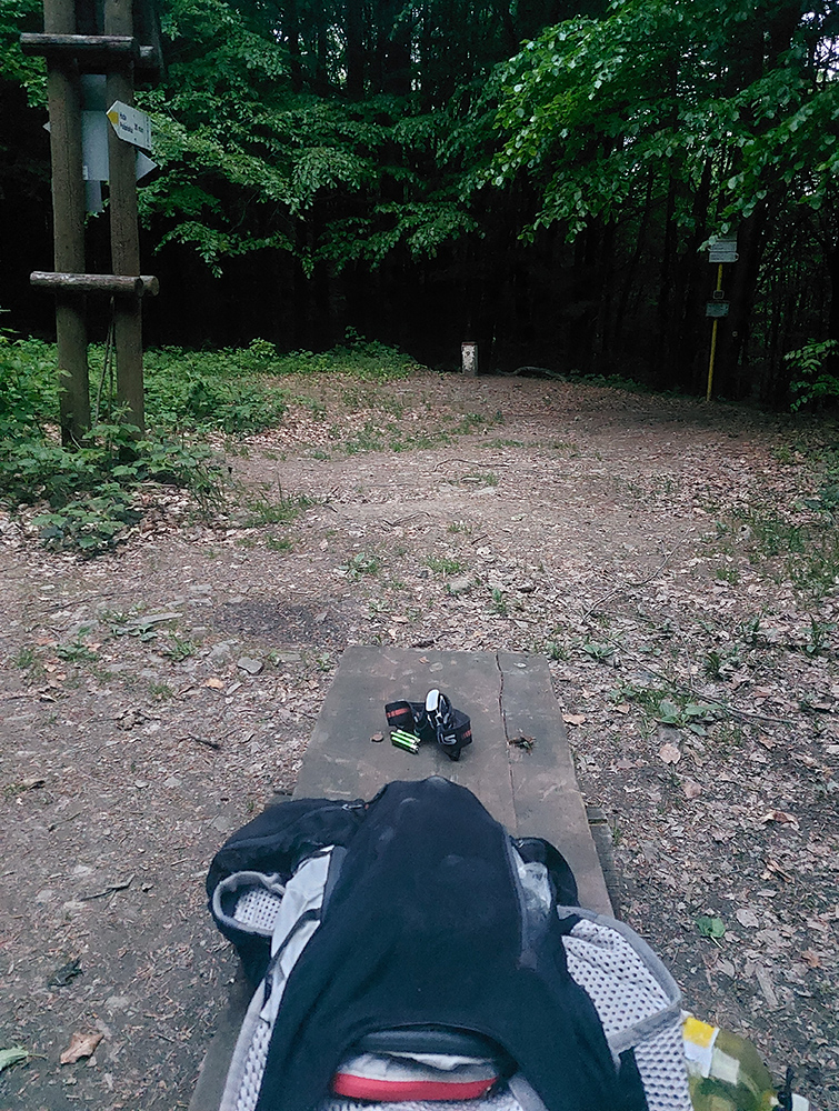 Zlatá hodinka sa nekoná, slnko skryli nízke mraky. Pod Roztockým lesom tečú priamo cez chodník v malých stržiach čerstvo vyliahnuté potôčiky – na napitie ledva, ale na večernú hygienu dobré, zmývam aspoň soľ z tváre. V sedle Mazgalica štartujem čelovku (20:30). Pod Filipovským vrchom nachádzam pri chodníku malú, haluzami krytú studničku, skôr len takú mláčku. Tak skúšam svoj zlepšovák – sáčok na naberanie vody, ale ten vrchnák z bidóna sa osvedčuje viac. Dukla je neďaleko a vody mám dosť, tak spokojnosť. Pod Stávkom tú ďalšiu studničku už nepotrebujem. Prekračujem stý kilometer a stále ma trochu mrazí pri pomyslení, že ešte ani v polovici nie som. Trasu som si tak symbolicky rozdelil na dve polovice – po Duklu a po Kremenec. Potom ten záver že už len tak na doklepnutie, to už bude nič. 36 km cieľová rovinka, ozaj ako nič, že? Hehe...