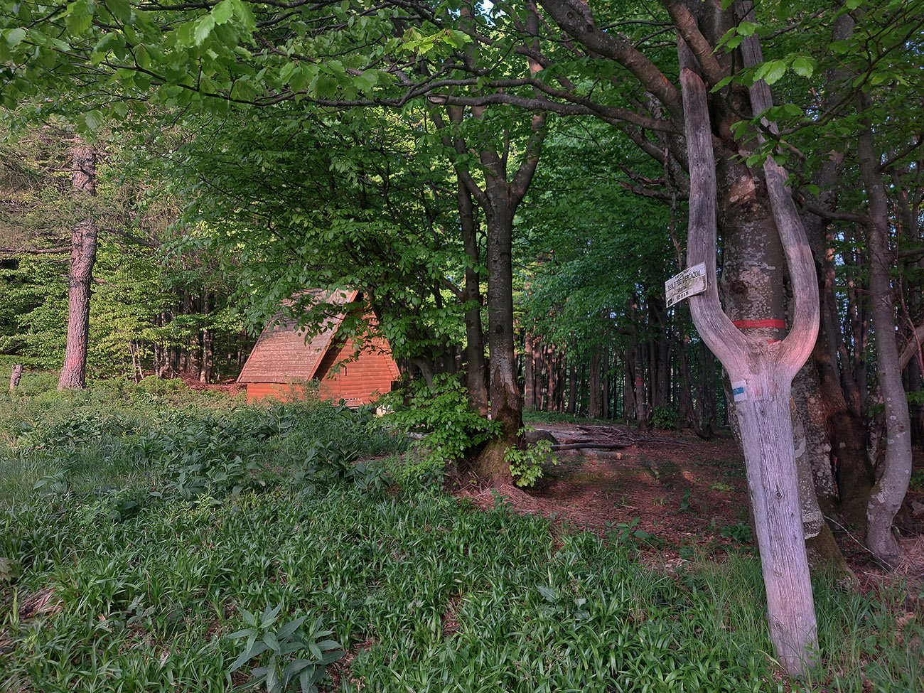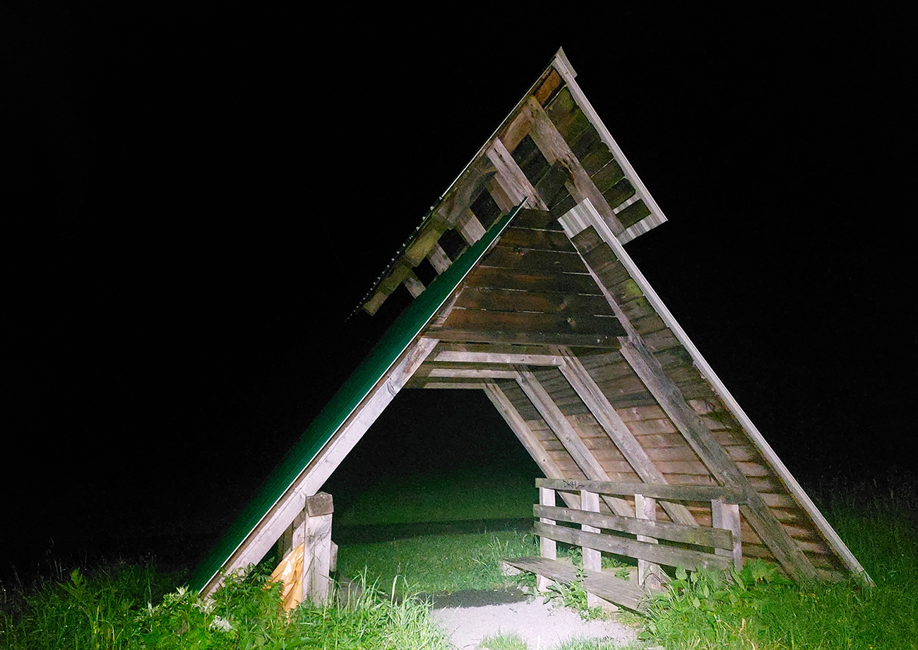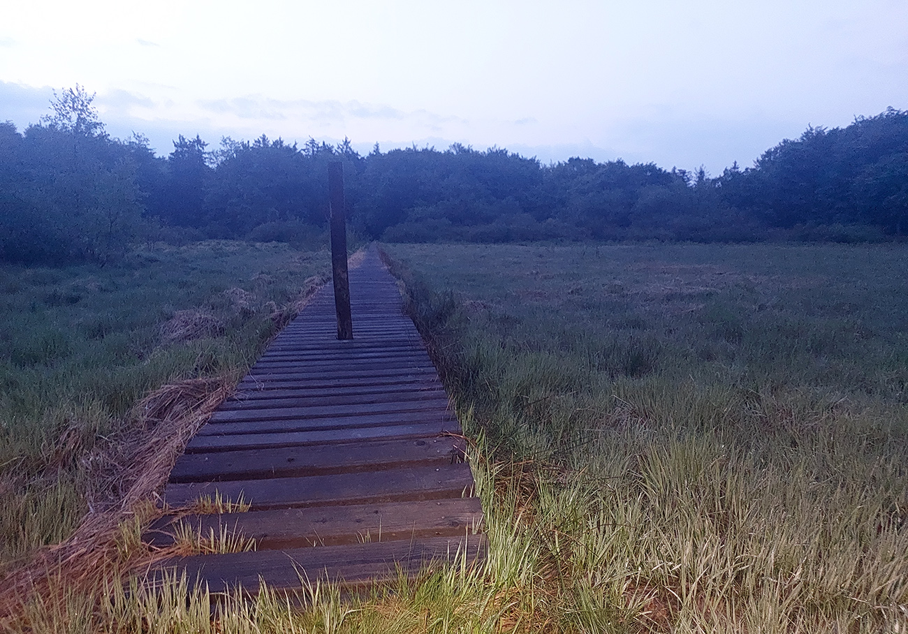 O pol štvrtej začína nebo blednúť a o štvrtej už všetky miestne spevavce vreštia ako divé. Vraj božské lesné ticho, no určite, hehehe... Krajina okolo Haburského rašeliniska je zaujímavá: zmena oproti bežným, kompaktným lesom doteraz, ako na prechádzke parkom si pripadám. Len v parku to pod nohami tak nečvachtá. O pol piatej balím čelovku, aj v prítmí lesa už vidím dobre. Ešte som si naposledy zasvietil do vodojemu, ktorý ma ale napriek očakávaniam a názvu sklamal. Je to len ruina. Na jej dne síce rúra a z nej výdatne tečie voda na pohľad lákavá, ale v mojom stuhnutom stave by som musel podať poriadny gymnastický výkon, aby som sa k nej dostal. Našťastie nemusím a po Balnicu ešte nejaké pramienky budú. V tejto „druhej polovici“ to s vodou už nie je také zlé ako pred Duklou.