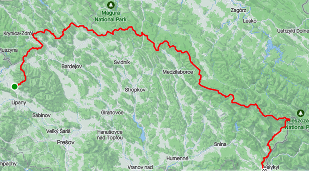Nie je náročná len parametrami (vraj 248 km a 10 500 v. m.) a logistikou (pre stredoslováka). Pre niekoho aj monotónnosťou, Furt v takom zelenom tuneli, len les a chodník. Kľukatosť je ďalšia výzva – myslel som si, že na hranici to bude pekne prečistené, ale nie. Na mnohých miestach obchádzačky, preliezačky, vyhýbačky. Buď popadaných stromov, alebo blata a hlbokých mlák v koľajach po autách, alebo jednoducho zarastených úsekov. Málo vody – ďalší problém. Na hrebeni a vo flyšovom podloží, klasika... Preto je dobré ísť na jar a mať aj nejaký malý „naberáčik“. Mne poslúžil vrchnák z cyklistického bidónu. Na druhej strane je to krásna divočina a pod nohami v podstate stále pohodlne mäkkúčko. Niekedy až príliš, hehe... Takže som zvážil plusy a mínusy a keď som si koncom mája myslel, že mám čosi natrénované, sadol som o druhej ráno do rýchlika a išlo sa. Výsledok je tu a pod obrázkom aj popis. Snáď niekomu pomôže: