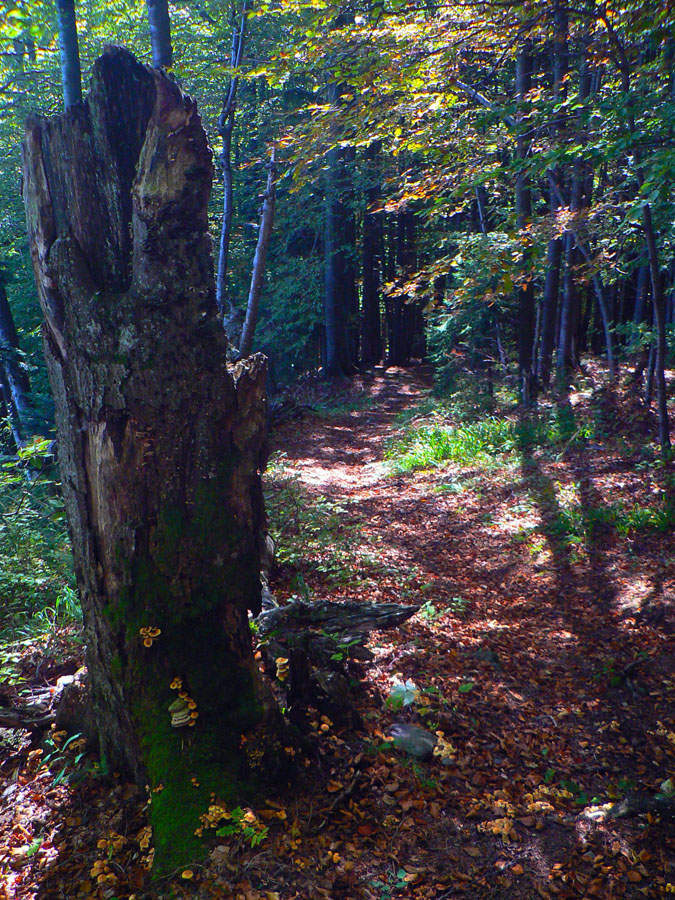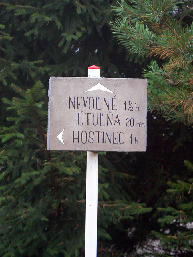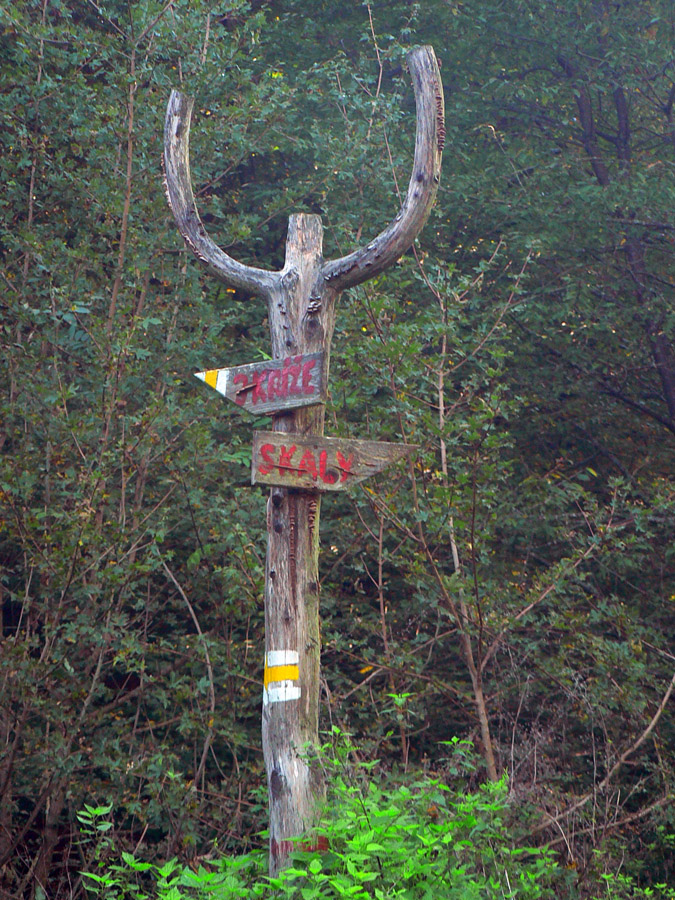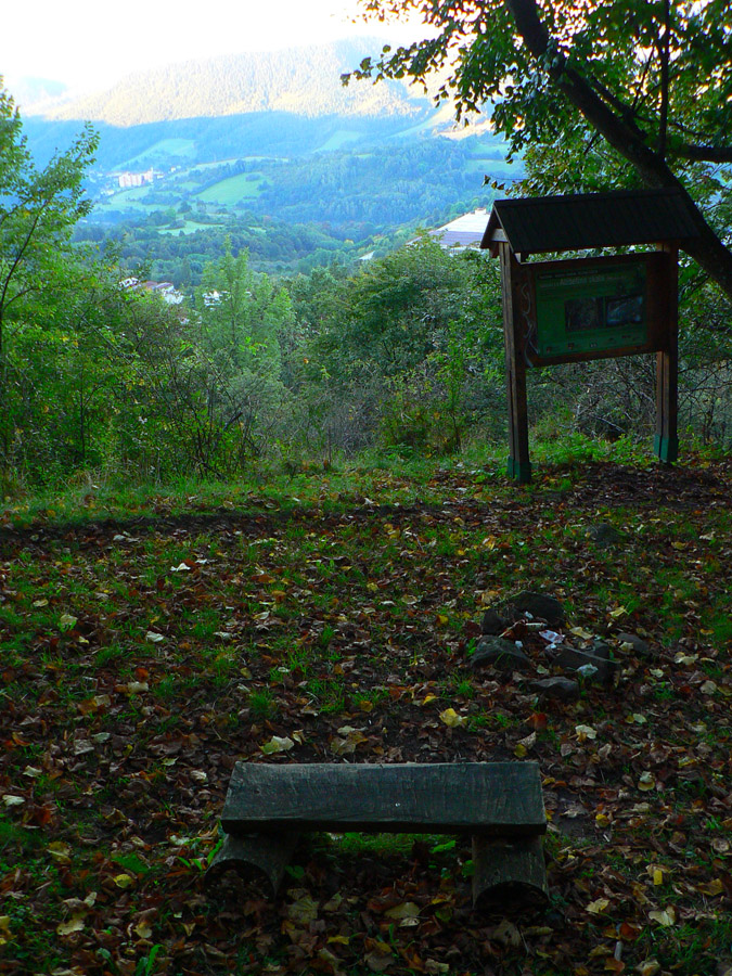 Do Kremnice som dovrčal motorákom, tak som si to trocha „skrátil“, nezačal som až zdola z námestia. Vrátil som sa len trochu nazad popri koľajniciach (smerom na sever) a bez problémov som trafil žltú, ktorá ich križuje. Ďalej to už také jednoznačné nebolo, hneď nad železnicou je viacero odbočiek a značky buď staré a neviditeľné, alebo žiadne. Až po spojenie s modrou značkou na Trojici to chce trochu sústredenia, ale žiadna tragédia. Smer je jasný. Na začiatok sa treba držať značiek náučného chodníka. V úvodnom strmšom stúpaní lesom sú aj tri náučné tabule.