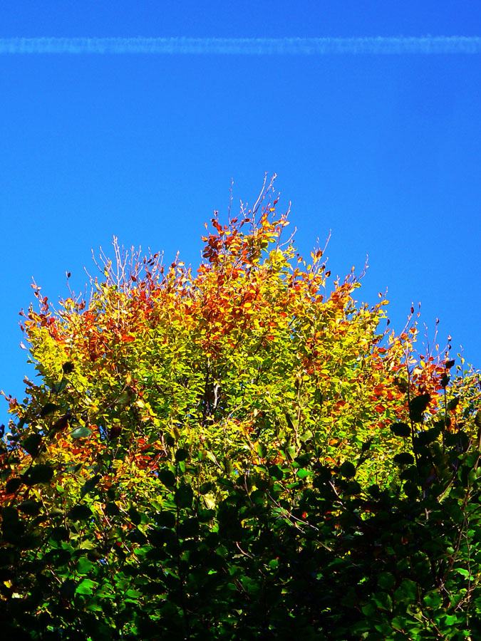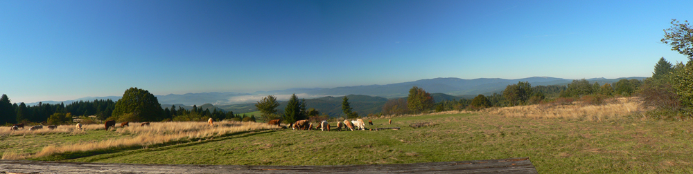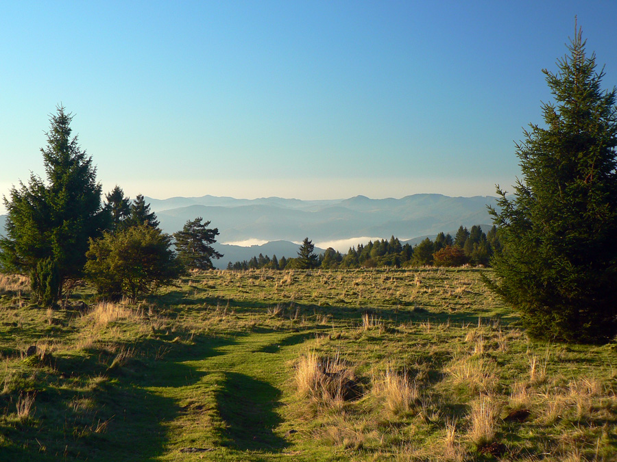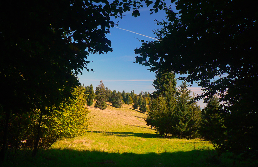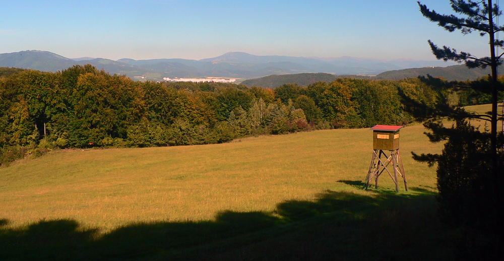 O 20 minút som nazad na žltej a valím si to jesenne farebnejúcimi pasienkami na Kremnický štít. Prečo štít, kto vie? Ale najmä je tu ďalšia odbočka do Nevoľného a zas ma stiahne, lebo kúsok nižšie je chata a prístrešok (vhodný aj na nocľah) s exkluzívnym výhľadom na hrebeň Vtáčnika, Štiavnické vrchy a komíny žiarskej hlinikárne. Zdola od útulne počuť chrapľavé nadávanie, to pastiera jalovice ani psiská nepočúvajú.