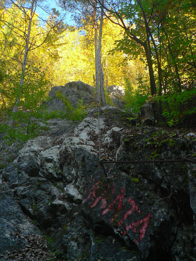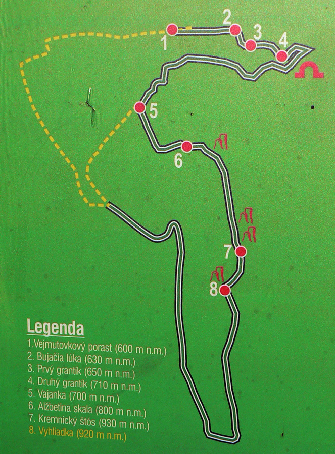 Z horného konca dediny sú dve možnosti: oficiálna po žltej a po asfalte, krajšia po pasienkoch „severným obchvatom“ dediny, popri ďalšom vysielači. Ovčie cestičky povedú :-) Treba len trafiť autobusovú zastávku pod dedinou, tam žltá odbočuje z hlavnej doprava k ovčínu a za rampou doľava dole, do lesa. Posledný úsek vedie zväčša príjemne lesom, len okolo napájadiel, kde už sa dlho nepasie, je žihľavy a bodľačia až až. Posledná zachádzka sa oplatí, lebo je tam, predstavte si, ferata!!! Síce taká cvičná, krátka, ale... Pekné cvičné skalky a pekný chodník popri nich, dá sa naň napojiť zo žltej značky na dvoch miestach. Potom už len farebný lesný tunel s čoraz širšou cestou, v ústrety približujúcemu sa štekotu strážnych psov a hluku rýchlostnej cesty. Vynáram sa v Kremničke, velím vľavo vbok a mašírujem k trolejbusovému depu na zastávku. Taká príjemná prechádzka - jednosmerka to bola, odporúčam.