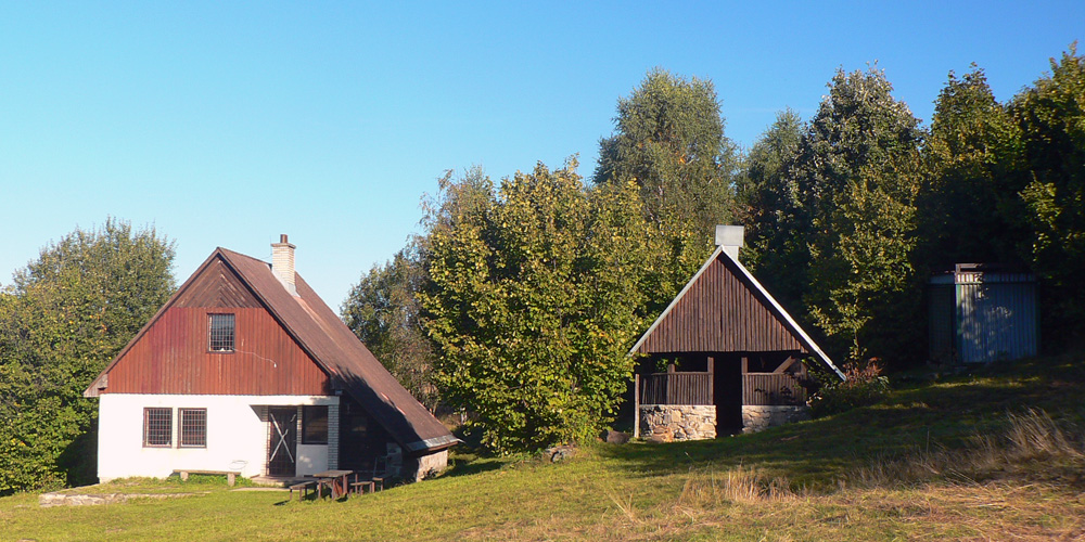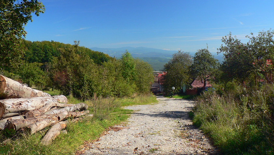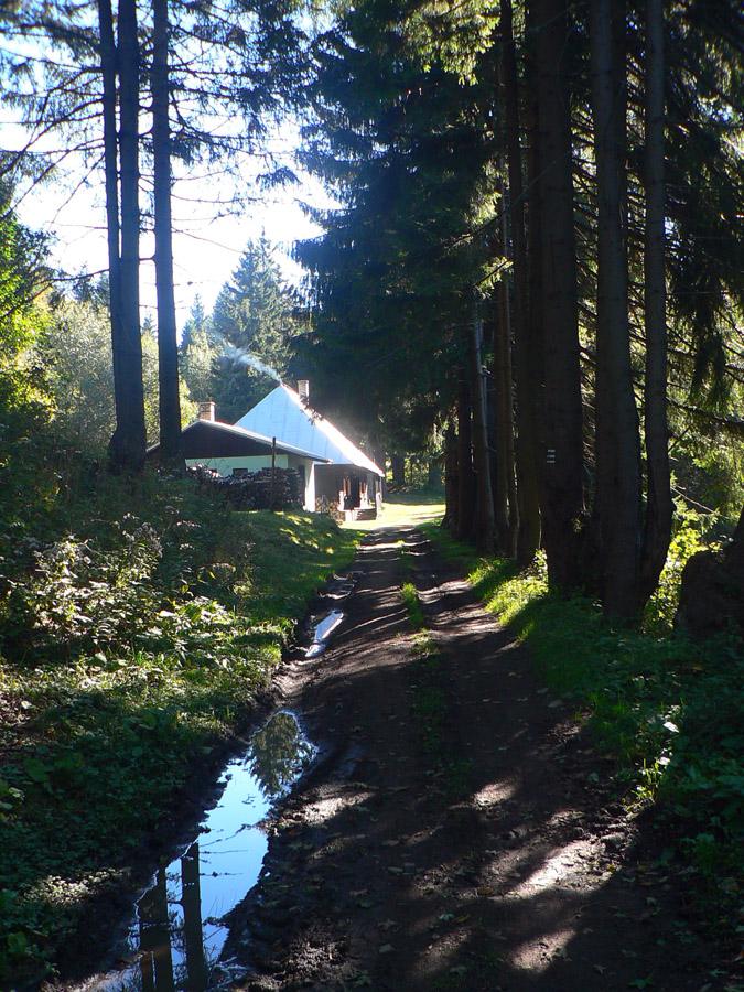 Na Hostinci je veselo, veď je nedeľa - a pekná, septembrová. Hádam to babie leto konečne prišlo. Dnu nejdem, len si dám trocha vody „U raneného bojovníka“ a posúvam sa ďalej. Do sedla Tri kríže je to len štvrťhodinka, ale radšej idem obchádzkou cez Velestúr, ako by som sa mal trepať po zvážnici. Tam nie sú ani výhľady, spod Velestúra aspoň jeden vďaka rúbanisku - Skalka je z neho ako na dlani.