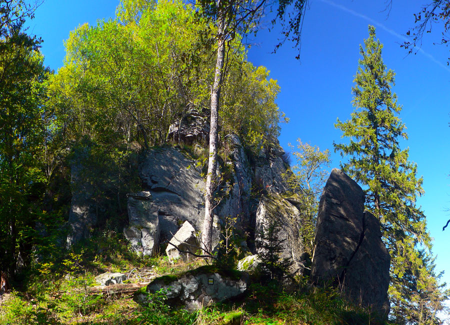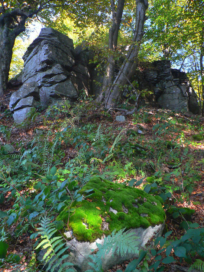 Hneď po vynorení na lúky Kremnického štósu je tu prvá zachádzka - šípka miestneho značenia posiela človeka doprava dole do Nevoľného, ale až do dediny nejdem. Lebo asi po pol kilometri svieti napravo pri okraji lesa ďalšia tabuľa a za ňou je skrytá „Skala lásky“ - bralo s perfektnou vyhliadkou na Kremnicu a kopce okolo nej. Oplatí sa!