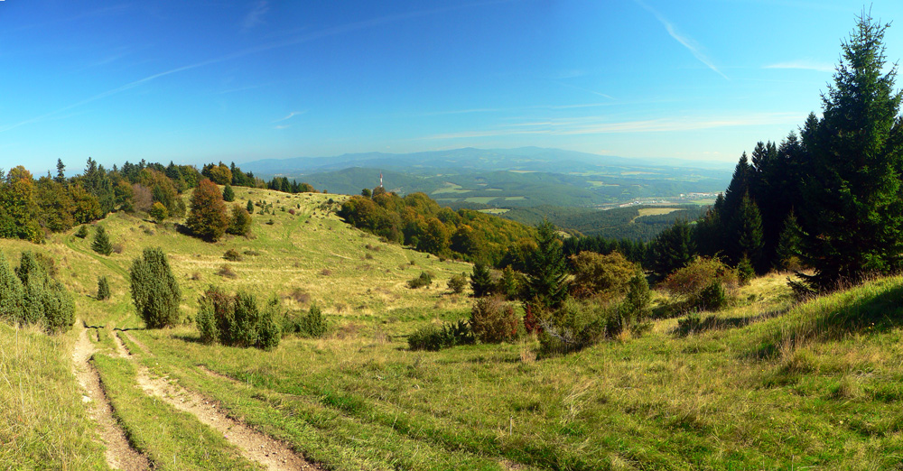 Preklápam sa na bystrickú stranu a dole kopcom pokračujem zas po žltej. Už to väčšinou nie je zvážnica, ale o dosť príjemnejší (aj keď strmší) lesný chodník. Povinná zastávka: vyhliadka Horná skala, krásna panoráma Malachovskej doliny s vysielačom naľavo, Krížnou a spol. vpredu a Bystricou napravo.