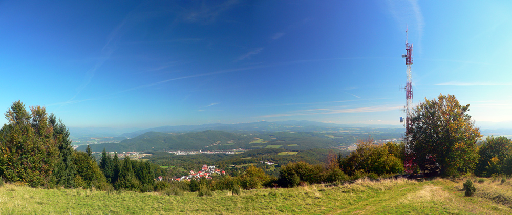 Pod Košiarmi ešte kratučká zachádzka k pamätníku sovietskych letcov a to už sa pomaly vynáram z lesa na lúky a pasienky, smerujem do Horných Pršian. Výhľady zas pribúdajú, najlepší je od vysielača nad dedinou. Je tam aj prístrešok, príjemné by bolo posedieť, nebyť toho elektrického bzukotu.