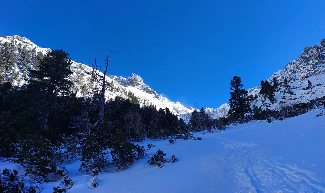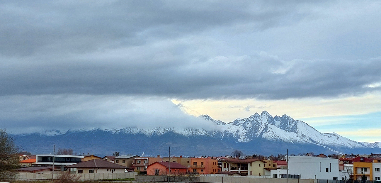 Na hrane pod Zlomiskovou vežou akoby sme vošli do sopečnej krajiny – tak sa z vrcholkov naokolo „dymilo“. To tam víchor víril snehy a posielal ich na východ. V doline ale pohoda a keď, tak len jemné potlačenie do chrbta. Nad hlavami azúro neskutočné, no pohľad vpred, do Železnej brány, ukazoval v nej poriadnu metelicu.