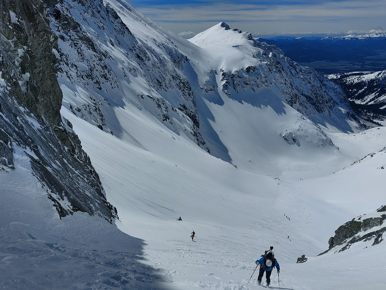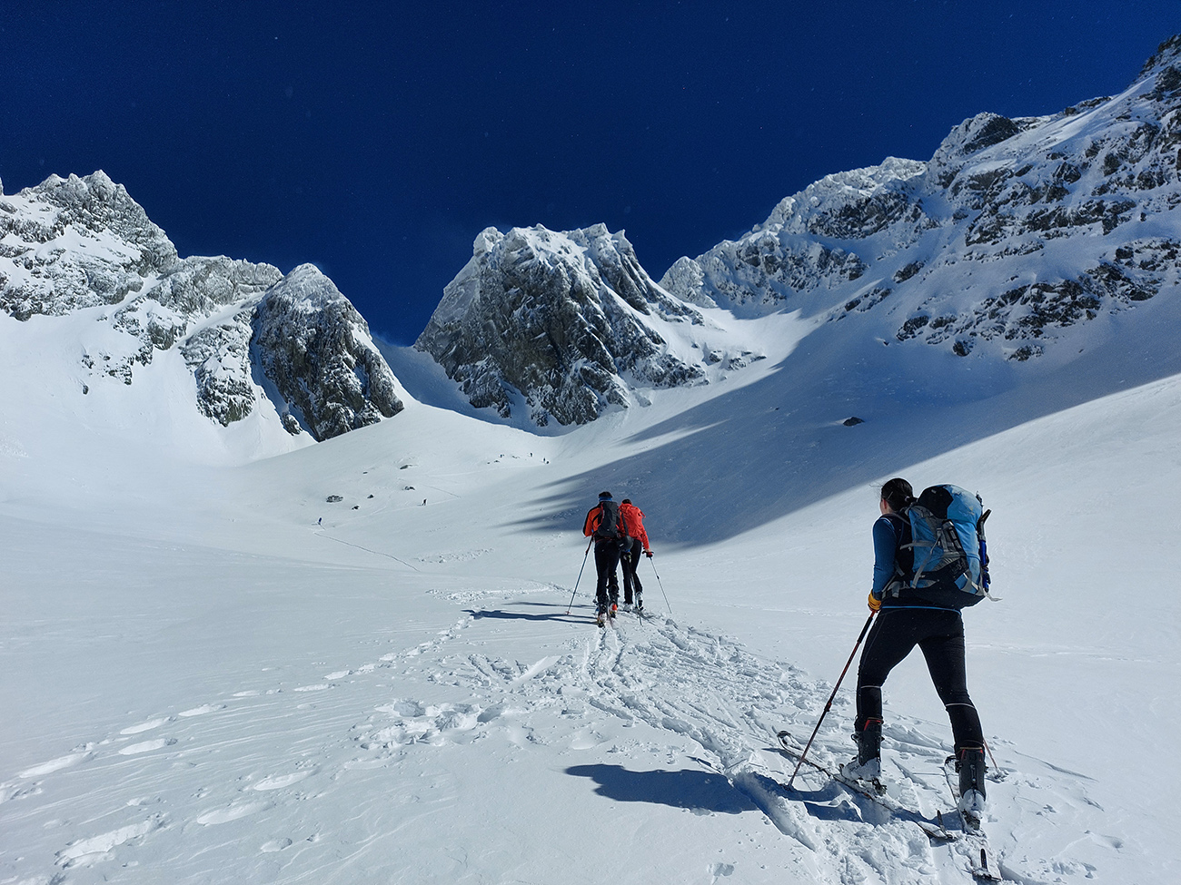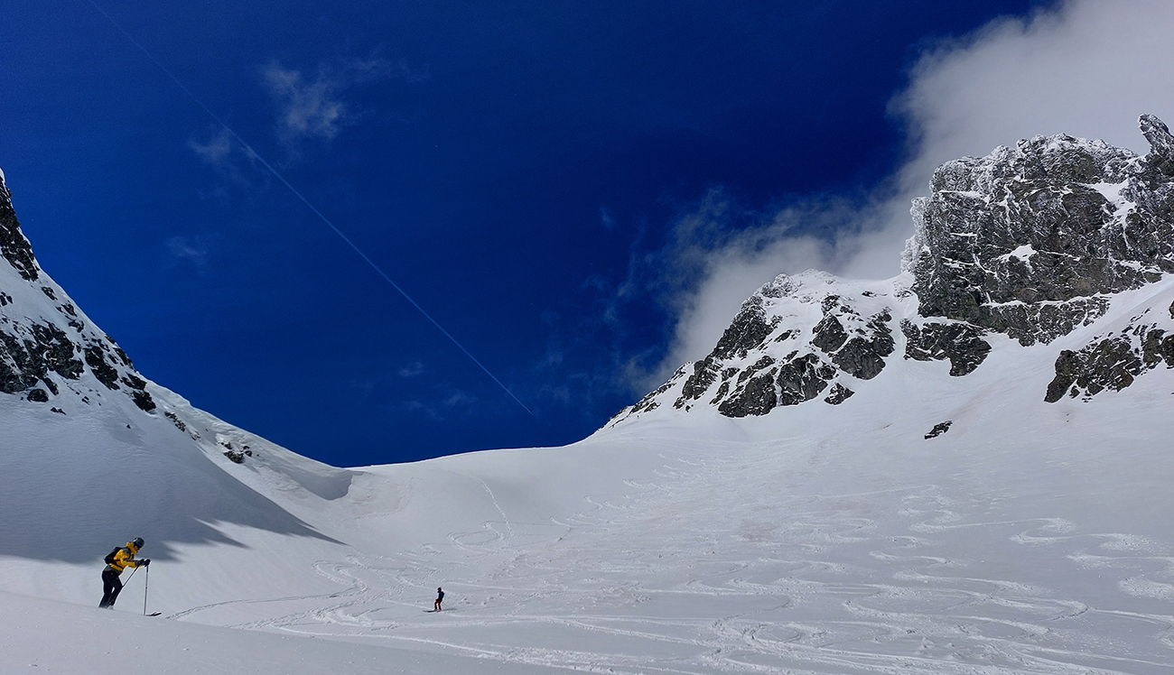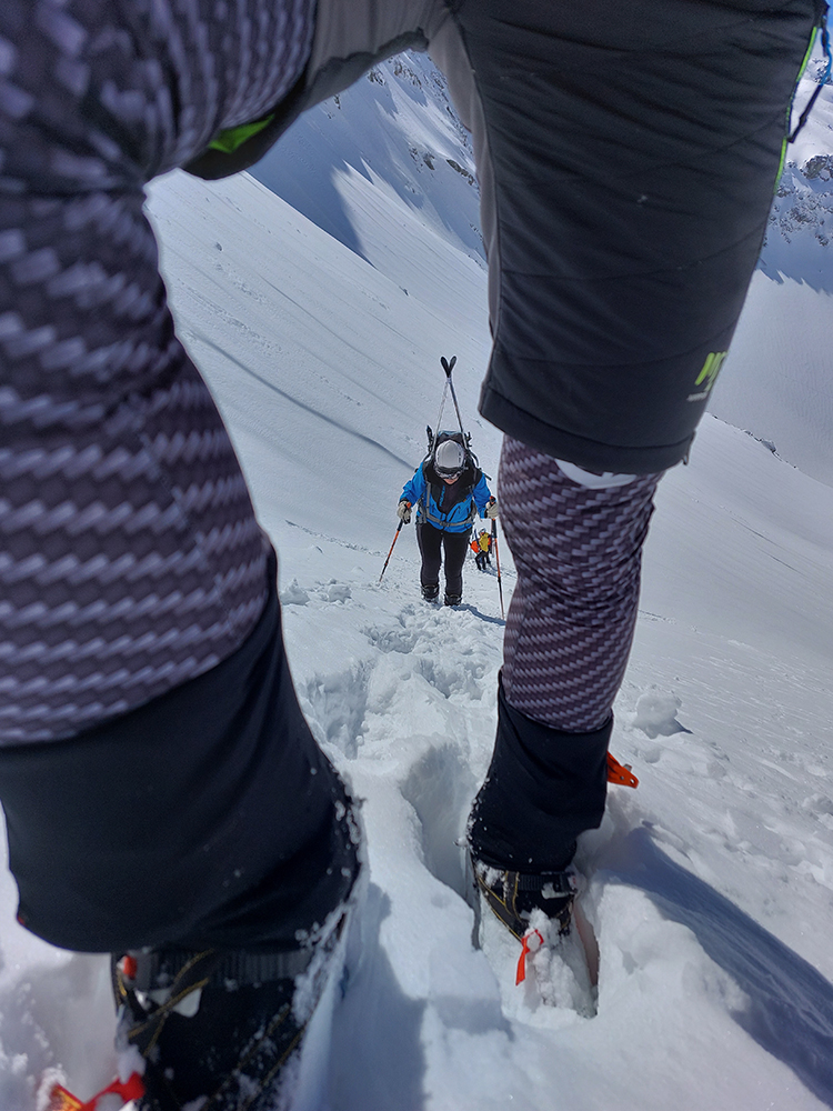 Tak nazad: lyžba nič moc, kombinácia vlhčiny a ľadovej hrčatiny. Nižšie lepšie, homogénnejšie. Zlákala nás čerstvá stopa do Strážneho sedla, našťastie cestou hore moc nepieklo a vietor chladil. Ďakujeme predjazdcom, ktorí to potiahli do Západnej Železnej brány a predjazdkyniam smerom do Strážneho sedla. Ony potom valili nazad dole do Železnej kotliny, my na opačnú stranu, do Kotliny pod Dračím sedlom. Miestami aj príjemná lyžovačka to bola!