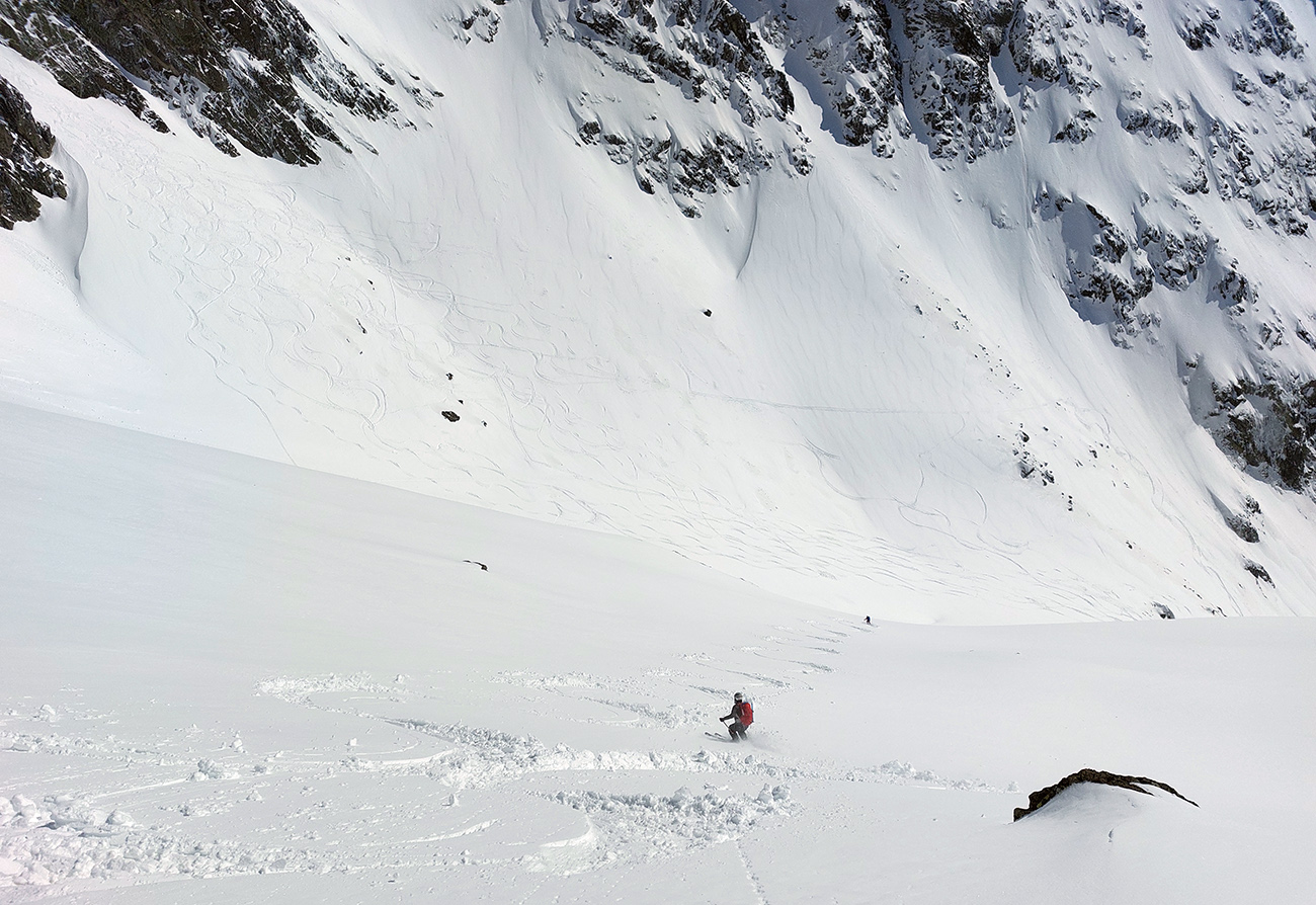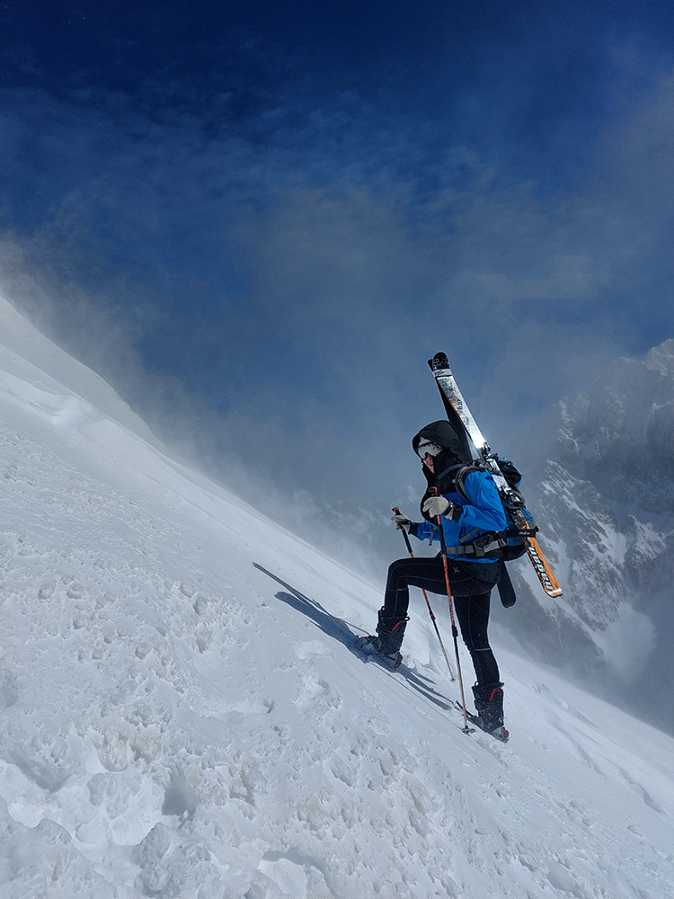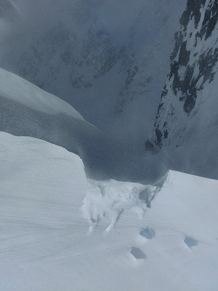 Aj tak bolo: schodíky sme síce už mali, ale hore boli víchrom zaviate, ani mačky sa do toho ľadu miestami moc nechceli zasekávať. Posledné metre pekne po špičkách. Hore prevej, za ním neviditeľno, ako tam nárazy uragánu vírili sneh. V ich prestávkach sa zdola škeril čerstvo načechraný a poriadne veľký vankúš – no neodvážil by som sa tam nalyžovať.