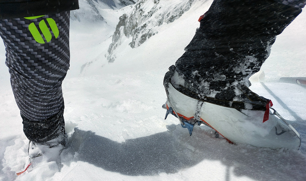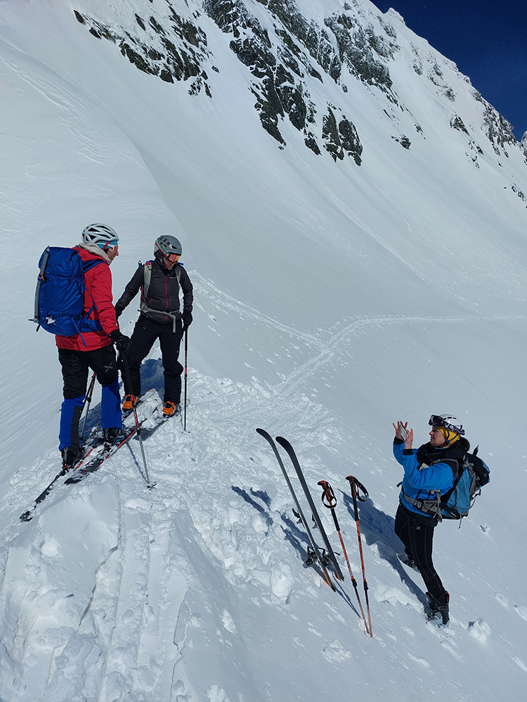 Strmý južný traverz ponad Ľadové pleso, to bol taký hic, že fuj. A suchý sneh hneď sa zmenil na lepidlo. Lenže nezlepené s podkladom. Depo na križovatke výstupov do Východnej Železnej a Zlomiskovej štrbiny: mačky jednoznačne! Tam dole nového snehu aj do 20 cm, hore ale bolo vidno ľad.
