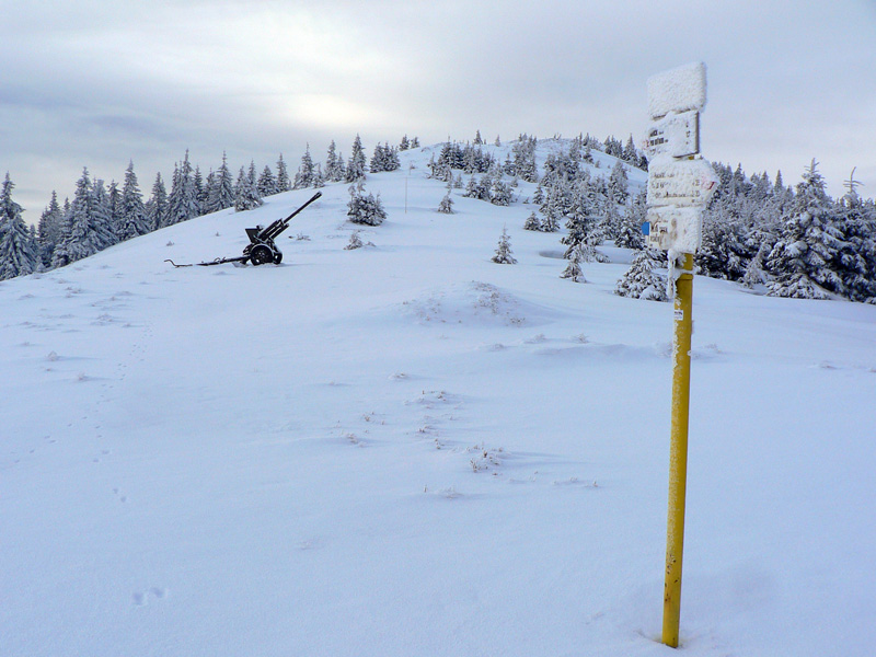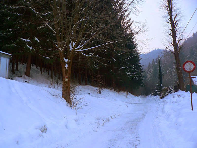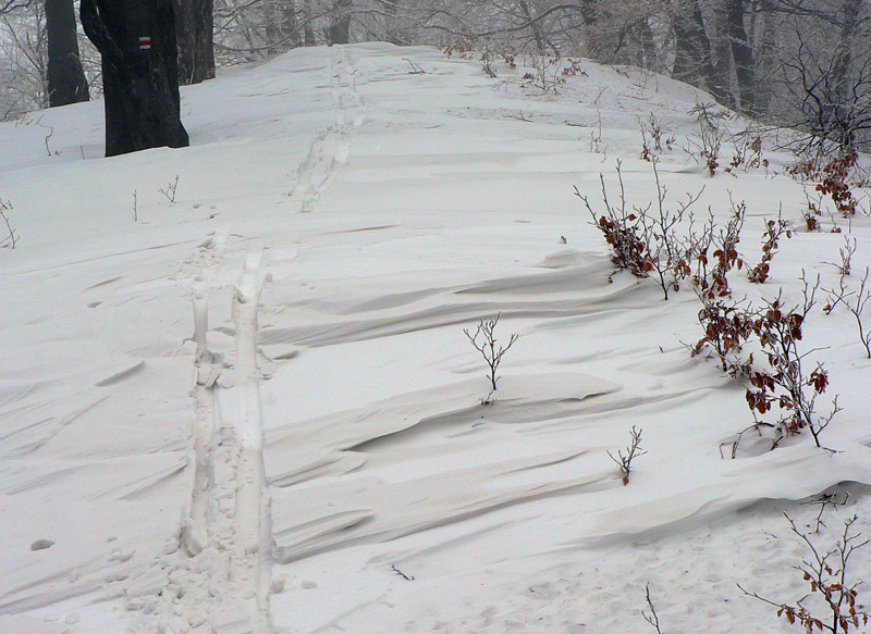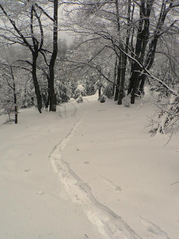 Medzi sedlami Rakytie a Javorina zasnežená zvážnica, len jedny zafúkané staré stopy, ale príliš na široko. Niekto šiel dolu na lyžiach. Čím vyššie, tým viac snehu, hore som dokonca rozmýšľal, že si zalyžujem lesom zo zvážnice na zvážnicu. Tam kde sa zvážnica a značka (a plynovod) v sedle Javorina točia do protismeru o takmer 180 stupňov. Ale odolal som, v lese sa to stále len tvárilo ako v tých frírajderských filmoch, ale nebolo to ono:-)