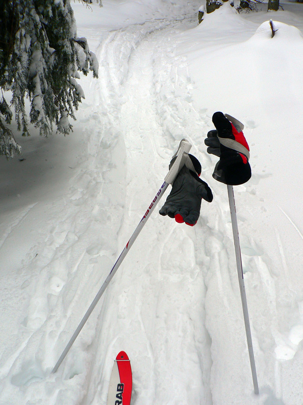 Medzi Minčolmi a Hoľami niet čo hovoriť, tvrdá a rovná stopa, len troška hrboľatá. Predsa len pešiakov sa tu motá viac ako šľapiek. Z Minčola tých pár metrov som lyže radšej zniesol - kvôli číhajúcim kameňom, ale aj škoda by bolo pásy odliepať. Na Hole som prišiel zarovno s ohlasovanými frontovými mrakmi, tak už len zjazdovka, „olympijský“ výsek v lese a partizánsky freeride. Ten ma potešil, lebo sa dal zlyžovať až dole. Tu na turčianskej strane bolo koncom januára aj dole v kotline oveľa viac snehu ako „v závetrí“ v Strečne. Aj stopa dole na zvážnici parádna, pekne som sa zviezol na lyžiach až do Vrútok.