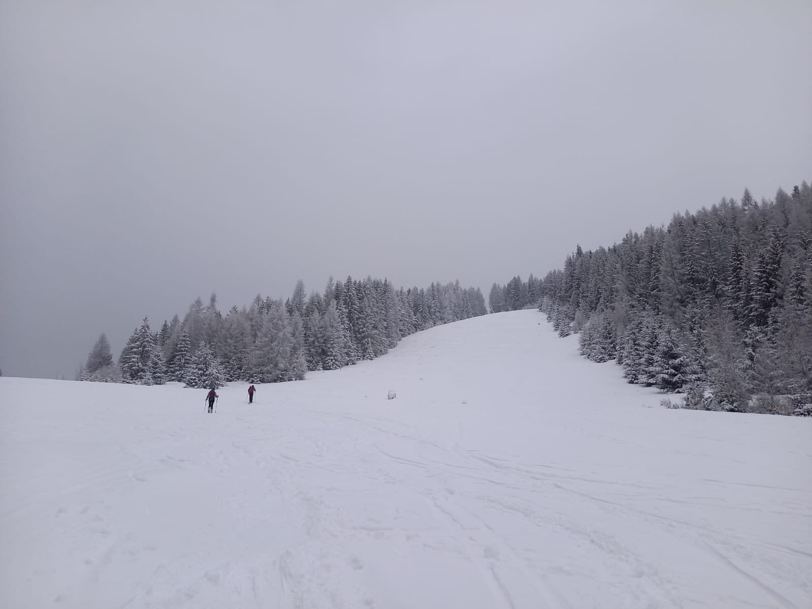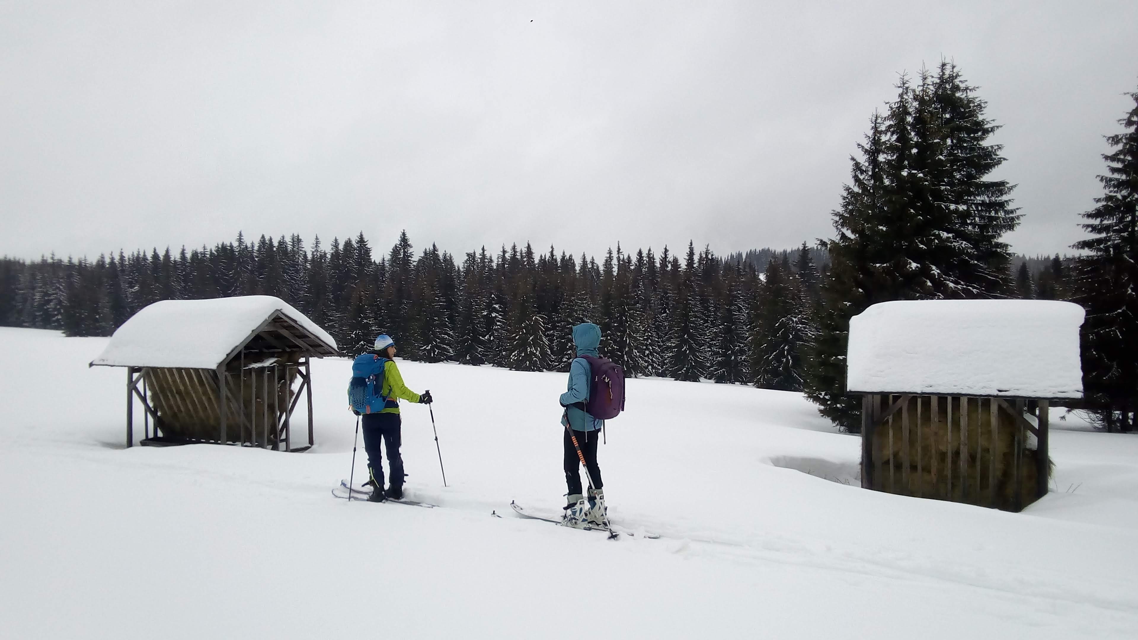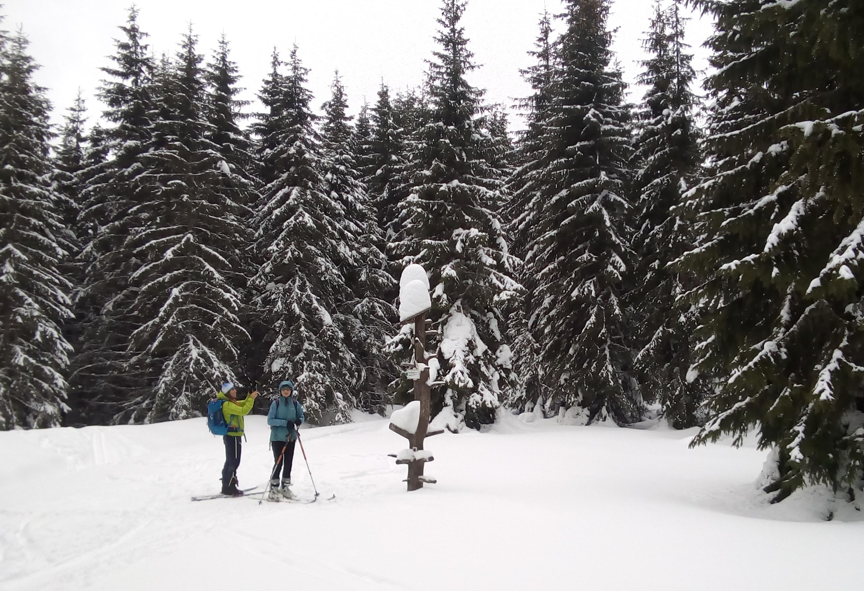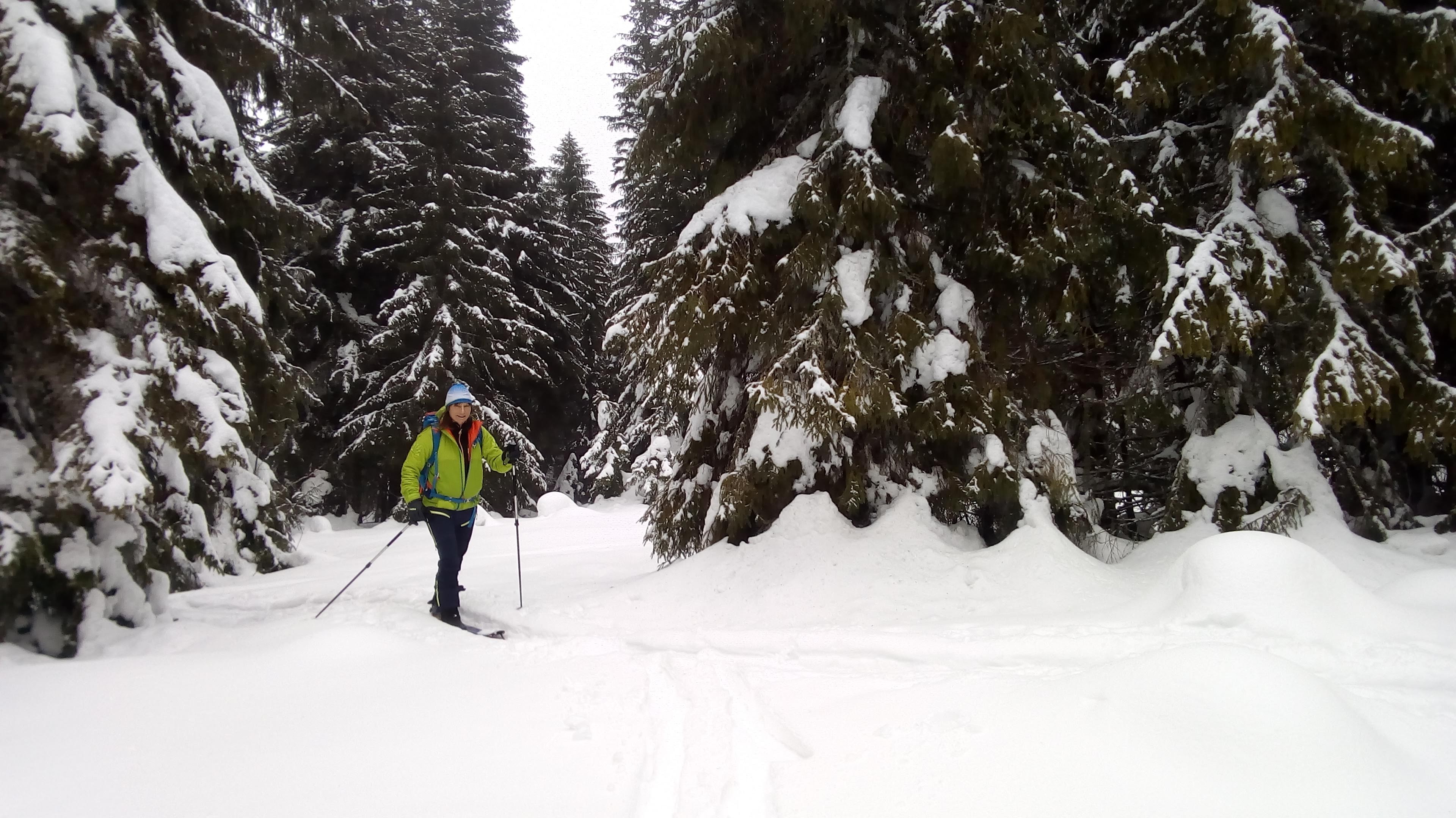 Začíname stúpať po zjazdovke skiareálu Vernár, na konci lana pokračujeme po červenej smer Kráľova hoľa. Úzke lesné koridory sa striedajú so širokými panenskými pláňami. Tadiaľ za pár hodín budeme svišťať dole! Všade ticho, ani lístok sa nepohne, samý ihličnan. Pár lyžiarov a snowbordistov kľučkuje oproti.