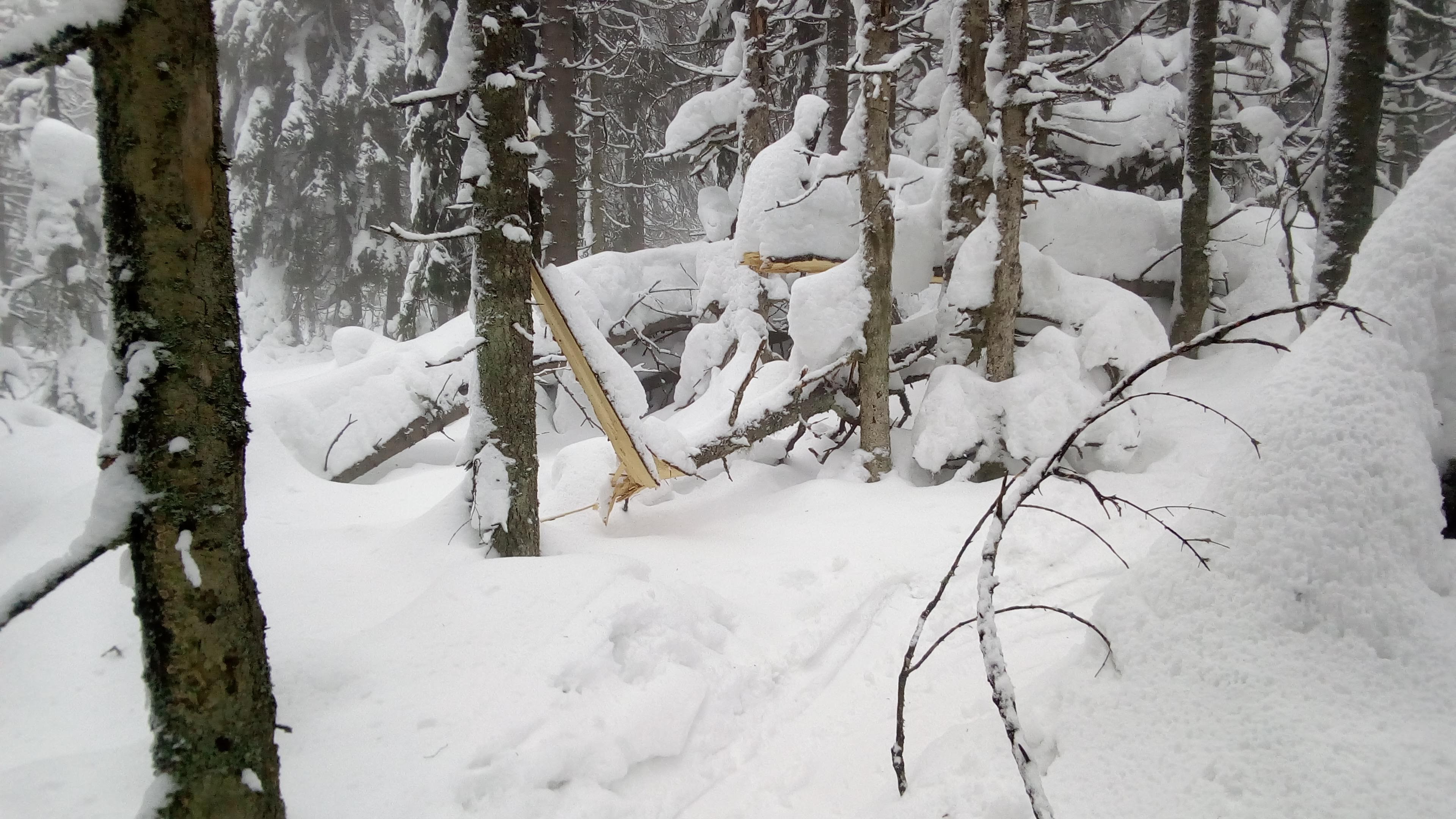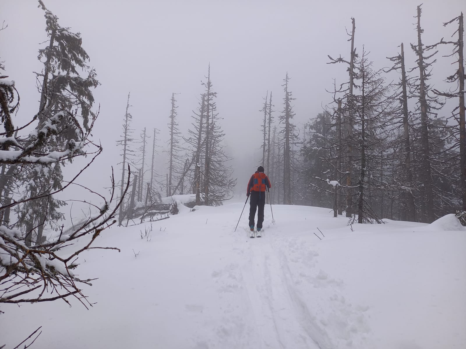 Na rázcestí Morna sa rozhodujeme pre dlhšiu variantu dookola cez Smrečiny, biela rozprávková krajina ako v hororovom filme láka stále neodolateľne ďalej a ďalej. Smrečianske sedlo, podľa smerovníka už len 2h40 na Kráľovu hoľu. Po čerstvej stope kľučkujeme neznačeným chodníkom na nižšiu Prednú hoľu 1545m, častý to cieľ miestnych freeriderov, aj náš. Vrchol aj celý výlet v hmle, výhľady na Kráľovku dnes nie. Konečne plošinka kde sa odopínajú pásy, iniciačné miesto každého skialpinistu. Unavené pásy a prázdne termosky do batohov, mierny odmäk aj vo februári, divná doba pokračuje, obliekať sa veľmi netreba. Hlavne zapnúť zipsy, putká, úchyty, prepnúť všetky sofistikované páčky do správnej polohy, všetci traja hlásime "pripravení" riadiacemu stredisku, môžu začať odpočítavanie.