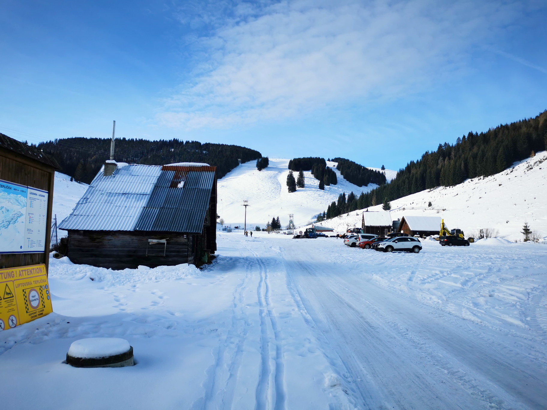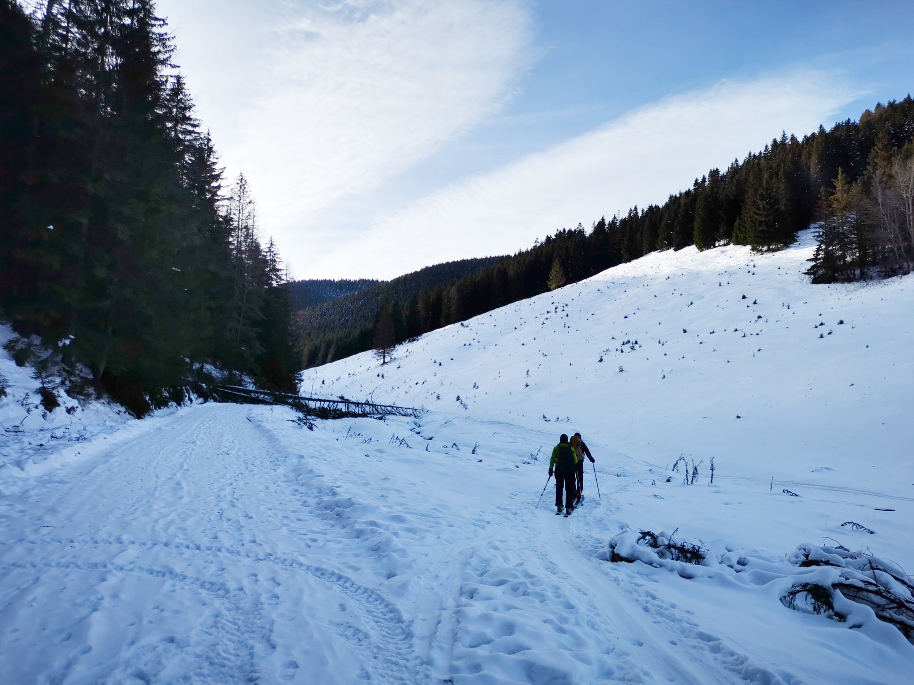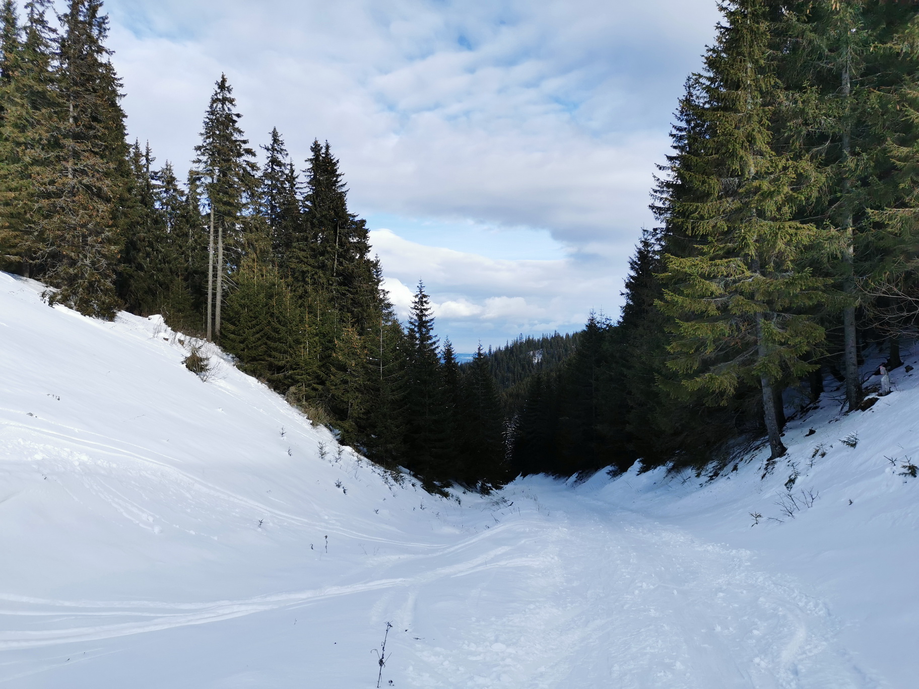 Dnes už sa v Liptovskej Tepličke konečne lyžuje opäť, dokonca na dvoch miestach v od seba nezávislých strediskách. My sa ale nejdeme lyžovať na vlekoch, parkujeme začiatkom zimy na veľkom parkovisku pod lyž. strediskom Smrečiny s cieľom zašlapať si na prvom snehu zimy. December začína dobre a tak šlapeme popod lyžiarsky svah známou cestou vedúcu hore na lúky pod Panskou hoľou. Cesta vedie lesom dolinkou zarezanou v severnom svahu a tak snehu sa tu darí už začiatkom zimy.