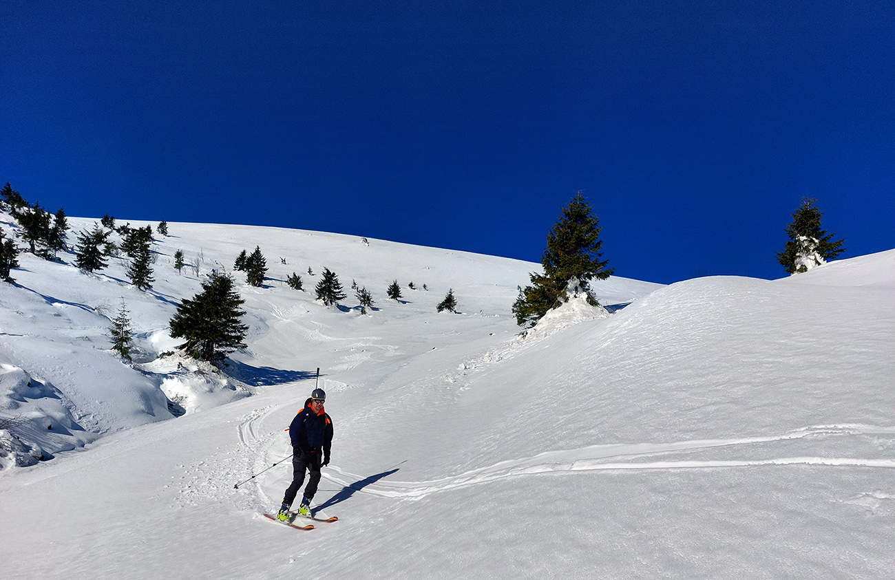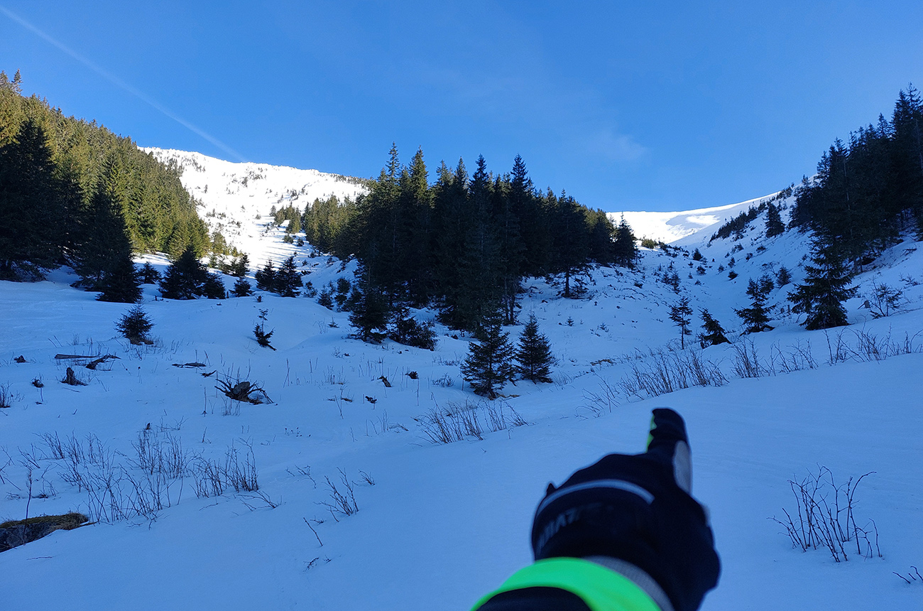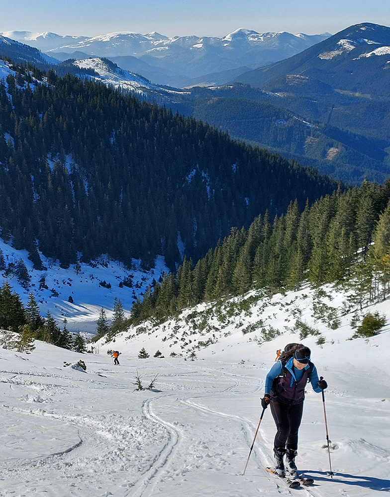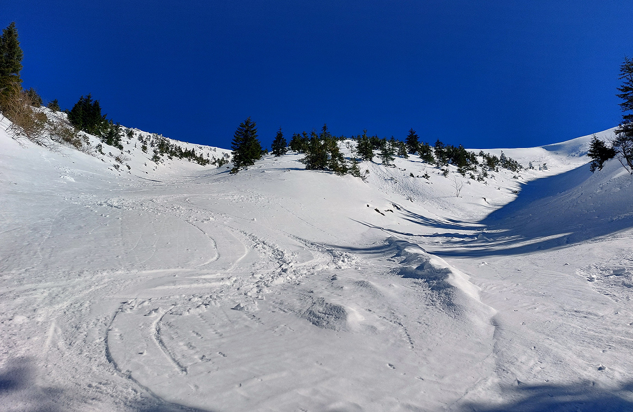 Ako sa to otvorilo, už sme si mohli vyberať, ktorou muldou na hrebeň. Vrhli sme sa najviac doľava, čiže do najširšej, najviac nasvietenej – aj keď len vo vrchnej časti. Čo najbližšie k Ďurkovej, aj keď reálne to najbližšie samozrejme nebolo. Ale nižšie v tieňoch zmrznutý sneh ako šmirgeľ, fasa držal, dalo sa aj v strmom pekne direkt po spádnici. A mimo stopy aj lepšie, lebo tá bola niekde až na ľad vyleštená. Potom vyššie, v strmých cikcakoch na slnku už to bolo trošku povolené. Spätné výhľady samozrejme maestro grandiózo.