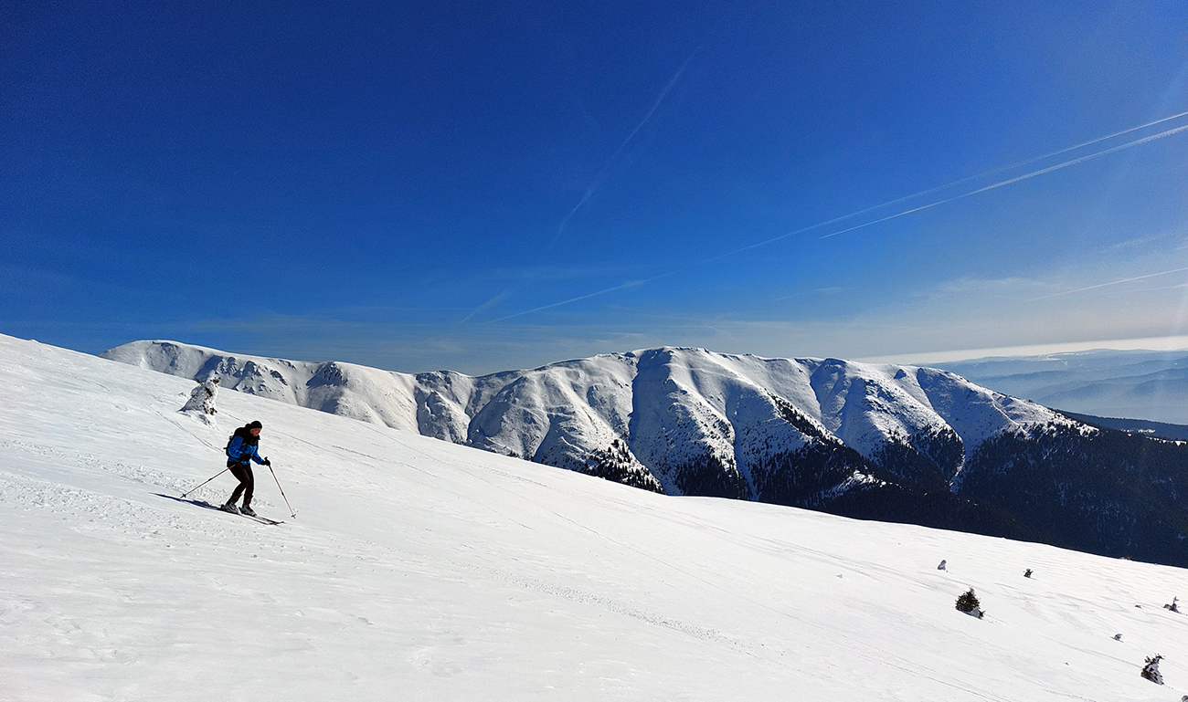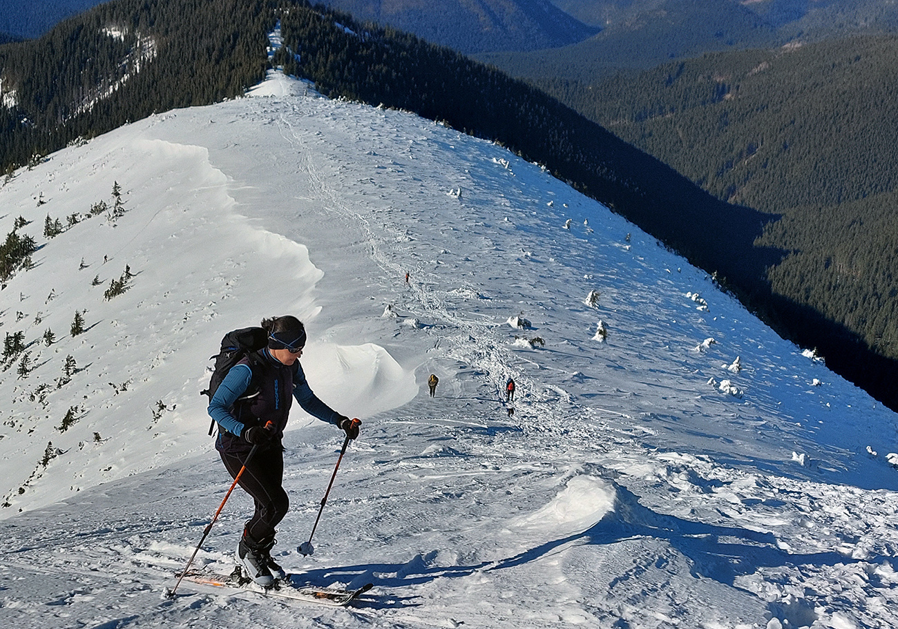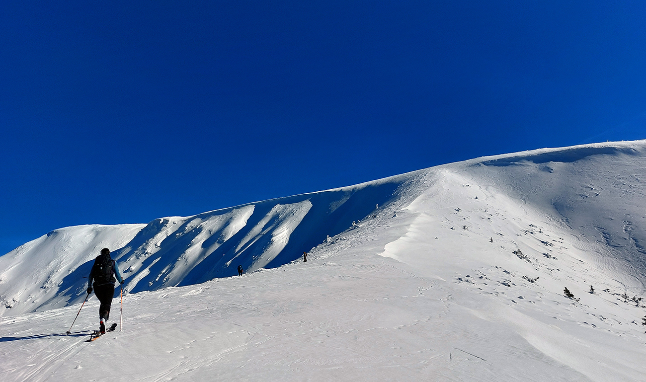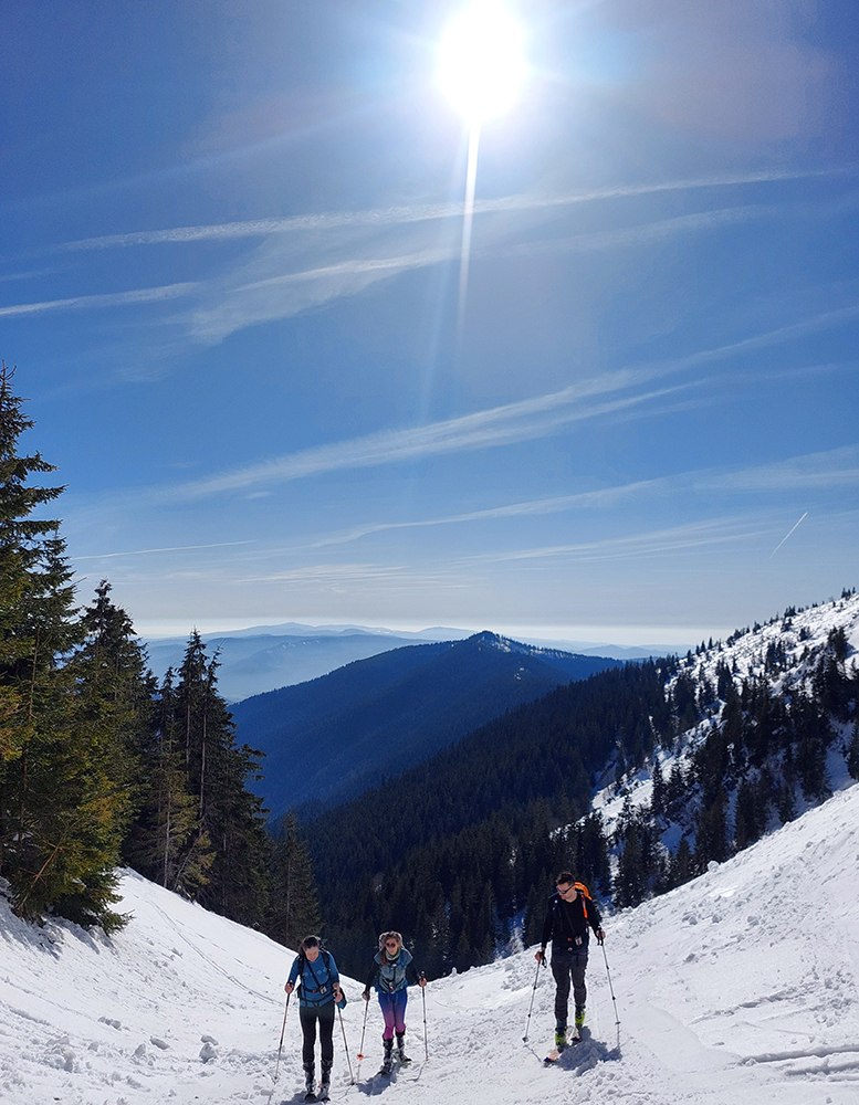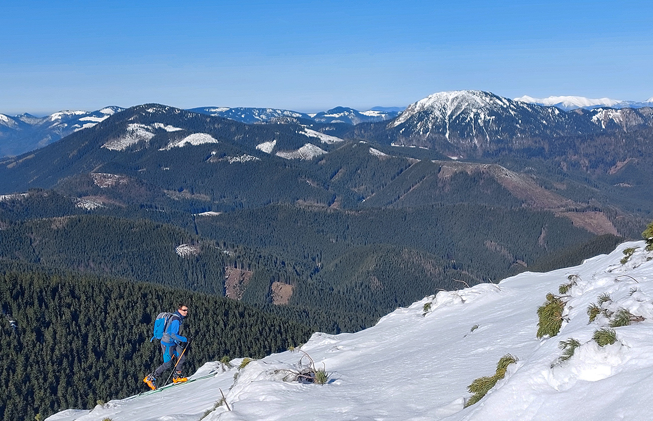 Ako sa to otvorilo, už sme si mohli vyberať, ktorou muldou na hrebeň. Vrhli sme sa najviac doľava, čiže do najširšej, najviac nasvietenej – aj keď len vo vrchnej časti. Čo najbližšie k Ďurkovej, aj keď reálne to najbližšie samozrejme nebolo. Ale nižšie v tieňoch zmrznutý sneh ako šmirgeľ, fasa držal, dalo sa aj v strmom pekne direkt po spádnici. A mimo stopy aj lepšie, lebo tá bola niekde až na ľad vyleštená. Potom vyššie, v strmých cikcakoch na slnku už to bolo trošku povolené. Spätné výhľady samozrejme maestro grandiózo.