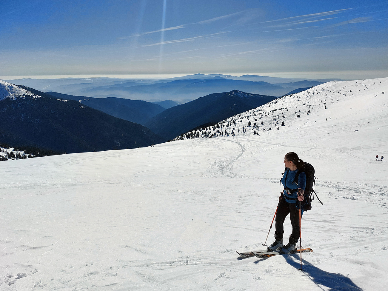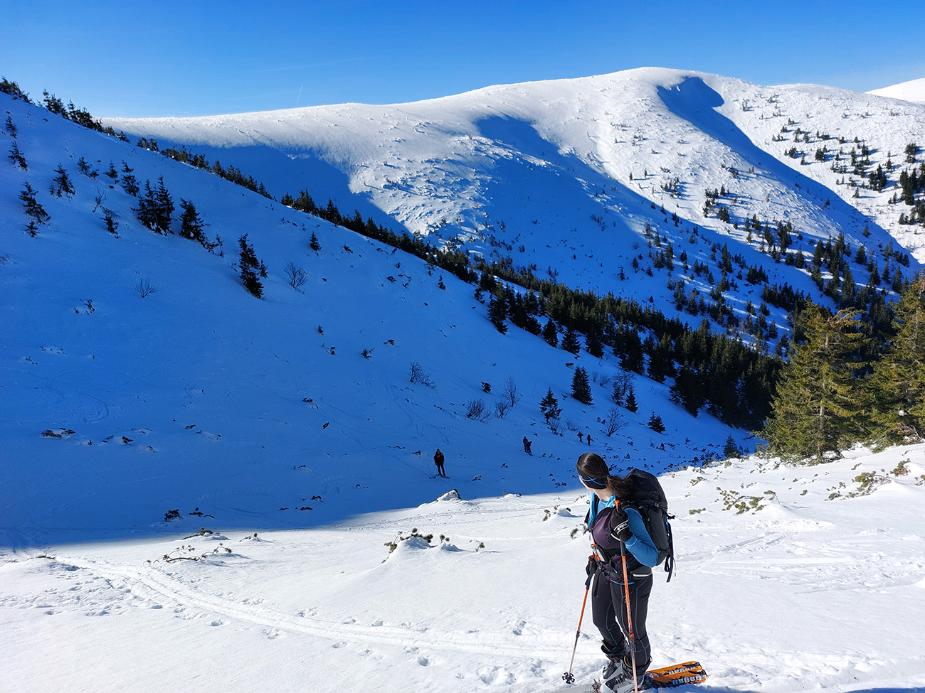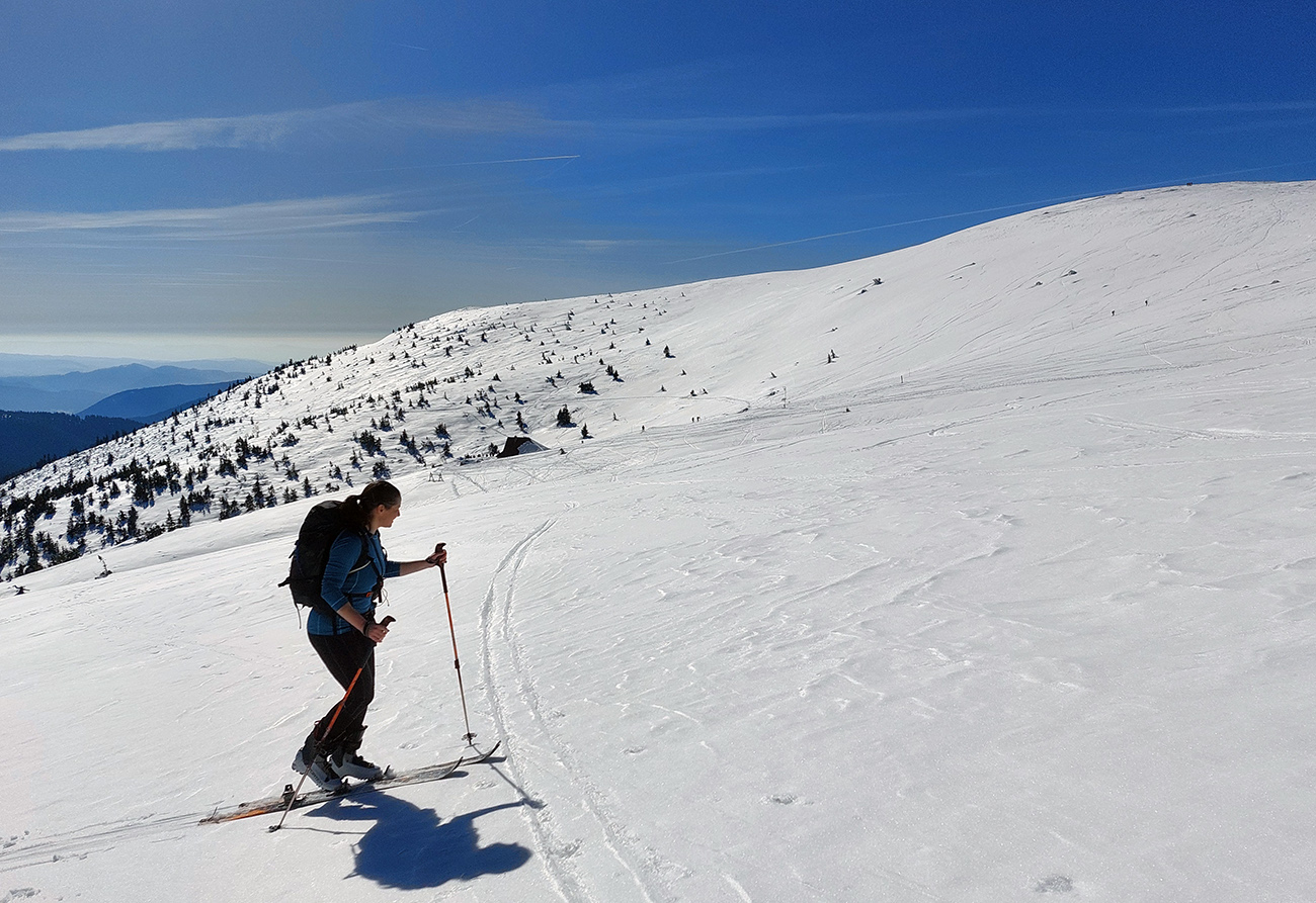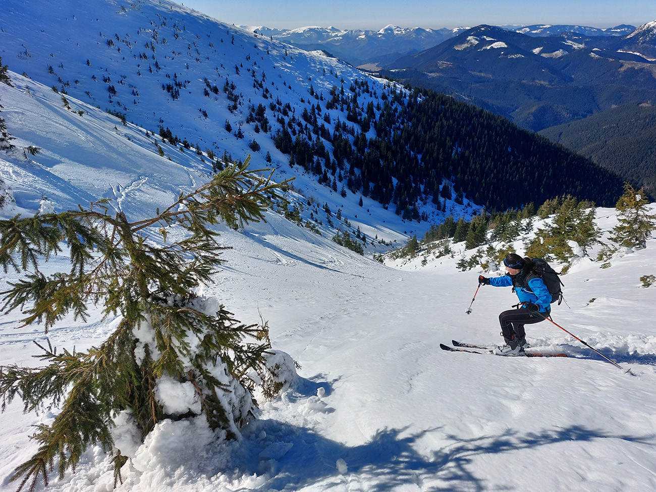 Ako sa to otvorilo, už sme si mohli vyberať, ktorou muldou na hrebeň. Vrhli sme sa najviac doľava, čiže do najširšej, najviac nasvietenej – aj keď len vo vrchnej časti. Čo najbližšie k Ďurkovej, aj keď reálne to najbližšie samozrejme nebolo. Ale nižšie v tieňoch zmrznutý sneh ako šmirgeľ, fasa držal, dalo sa aj v strmom pekne direkt po spádnici. A mimo stopy aj lepšie, lebo tá bola niekde až na ľad vyleštená. Potom vyššie, v strmých cikcakoch na slnku už to bolo trošku povolené. Spätné výhľady samozrejme maestro grandiózo.