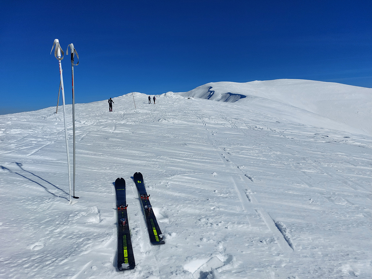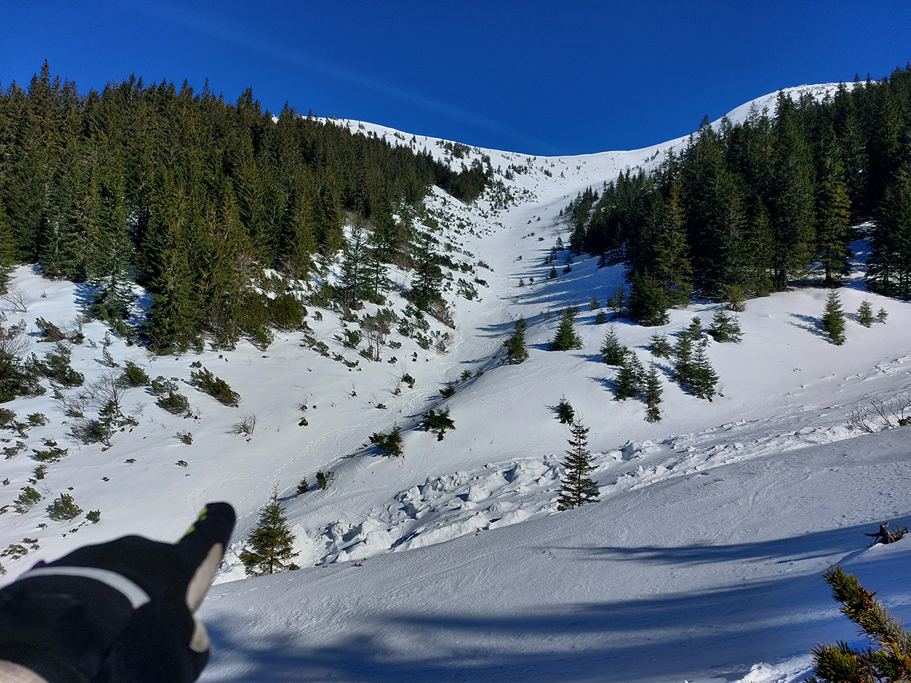 Prvé slabšie kusy už predtým emigrovali do útulne, teraz ďalšie dva, tak sme cestou dohodli časovo približnučké stretko na hrebeni a my čo ešte nabudení, davaj do severu. Pekne popri rázcestníku na hrebeni, že cez prevej dropneme backflipom priamo do tej muldy, z ktorej nedávno lavínka padla. Dole na dne ju vidieť, poriadne hrčovisko. Prevej ale slabý, tak sme nakoniec točili oblúky o jednu muldu na východ. Tam to bolo síce už pevnejšie a suchšie pod lyžami, ale dobré len na vrchu. Nižšie sneh veľmi nekonzistentný svojimi vlastnosťami, ktoré sa menili doslova v každom oblúku (vlhko, sucho, dosky, vankúše, mäkko, tvrdo...) a dosť nepríjemne to ťahalo za lyže.