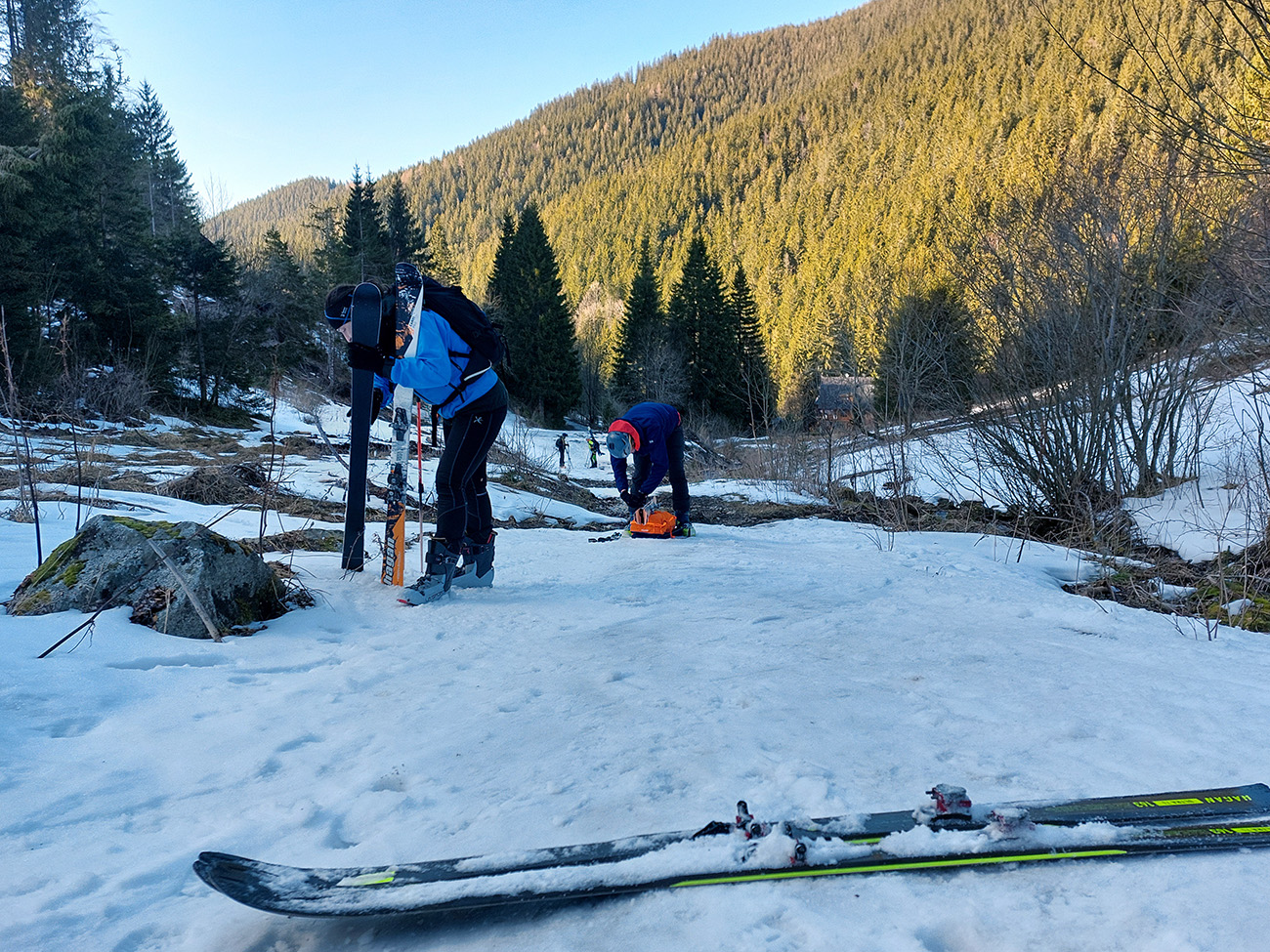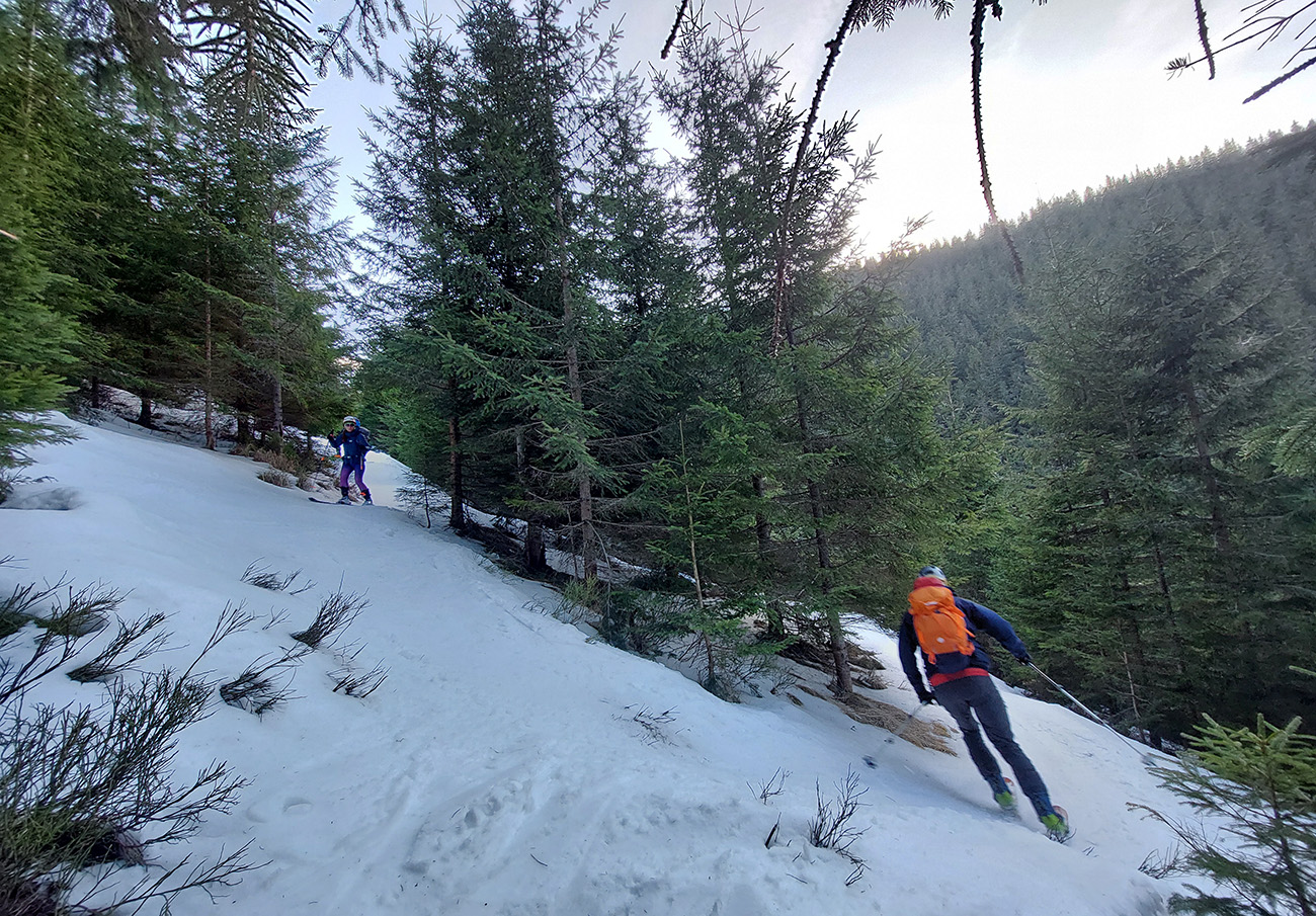 Po bočnom rebre a v nižšom sklone sme sa potom už svižnejšie vykľučkovali pomedzi kosodrevinovo-snehové hrče na Ďurkovú a išlo sa prvý raz lyžovať – popri útulni dole, že kam až snehy pustia. Pustili dákych 200 výškových: hore parádna lyžba na čerstvo odmäknutej tenkej vrstvičke, smerom dole stále hlbšie prebáranie do čoraz prehnitejšej riediny.