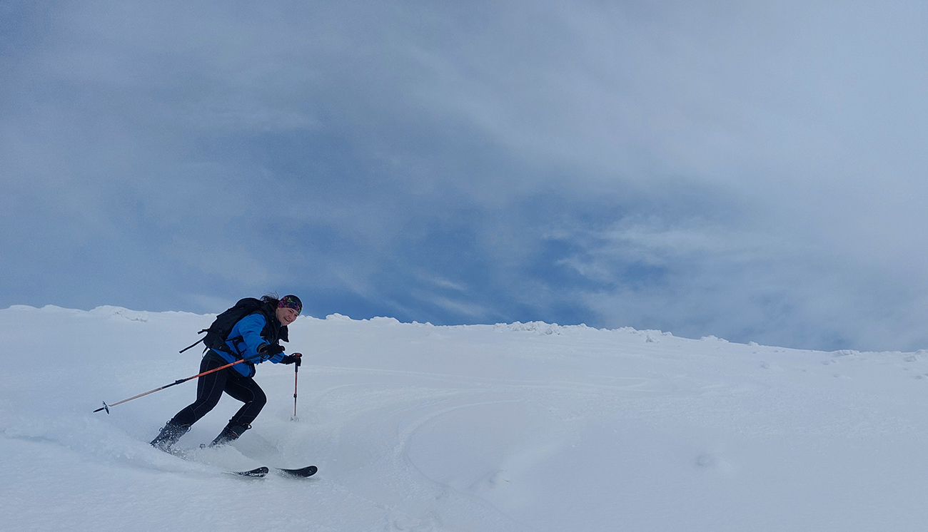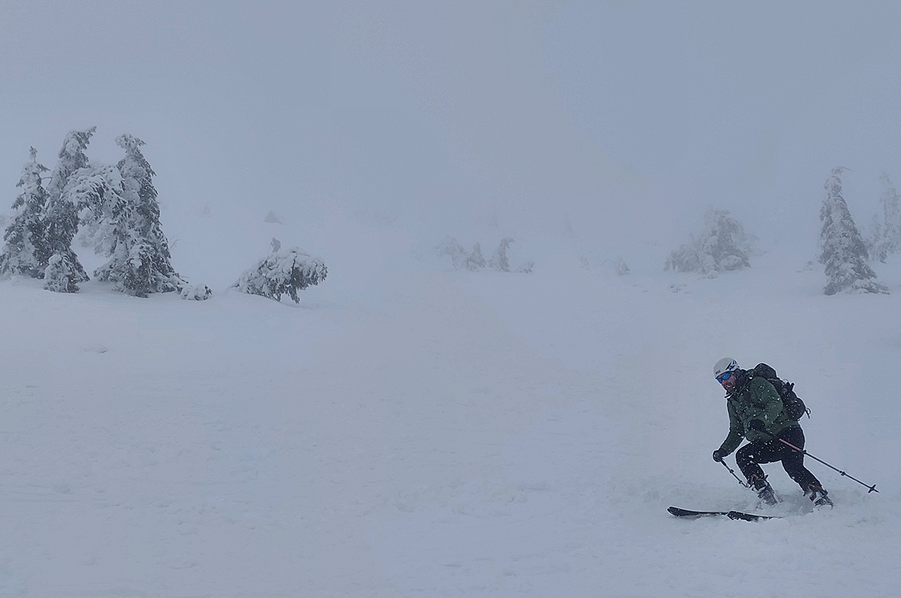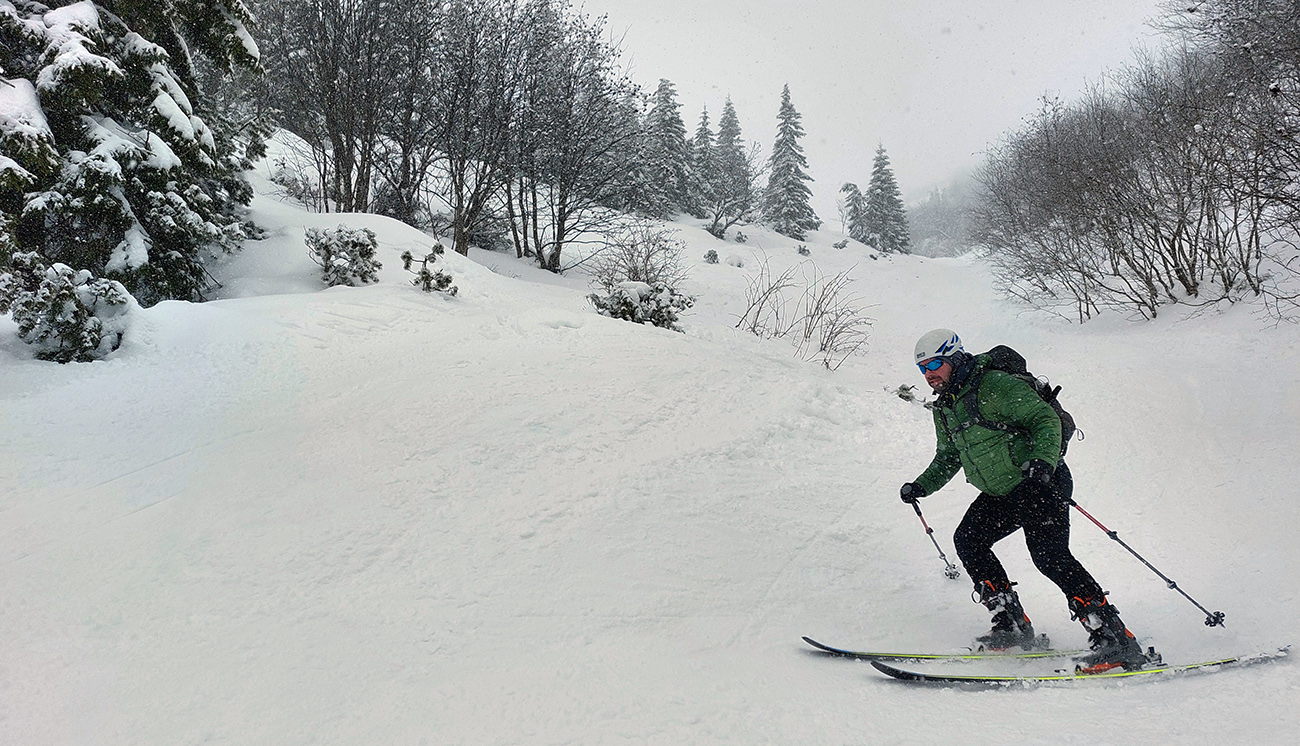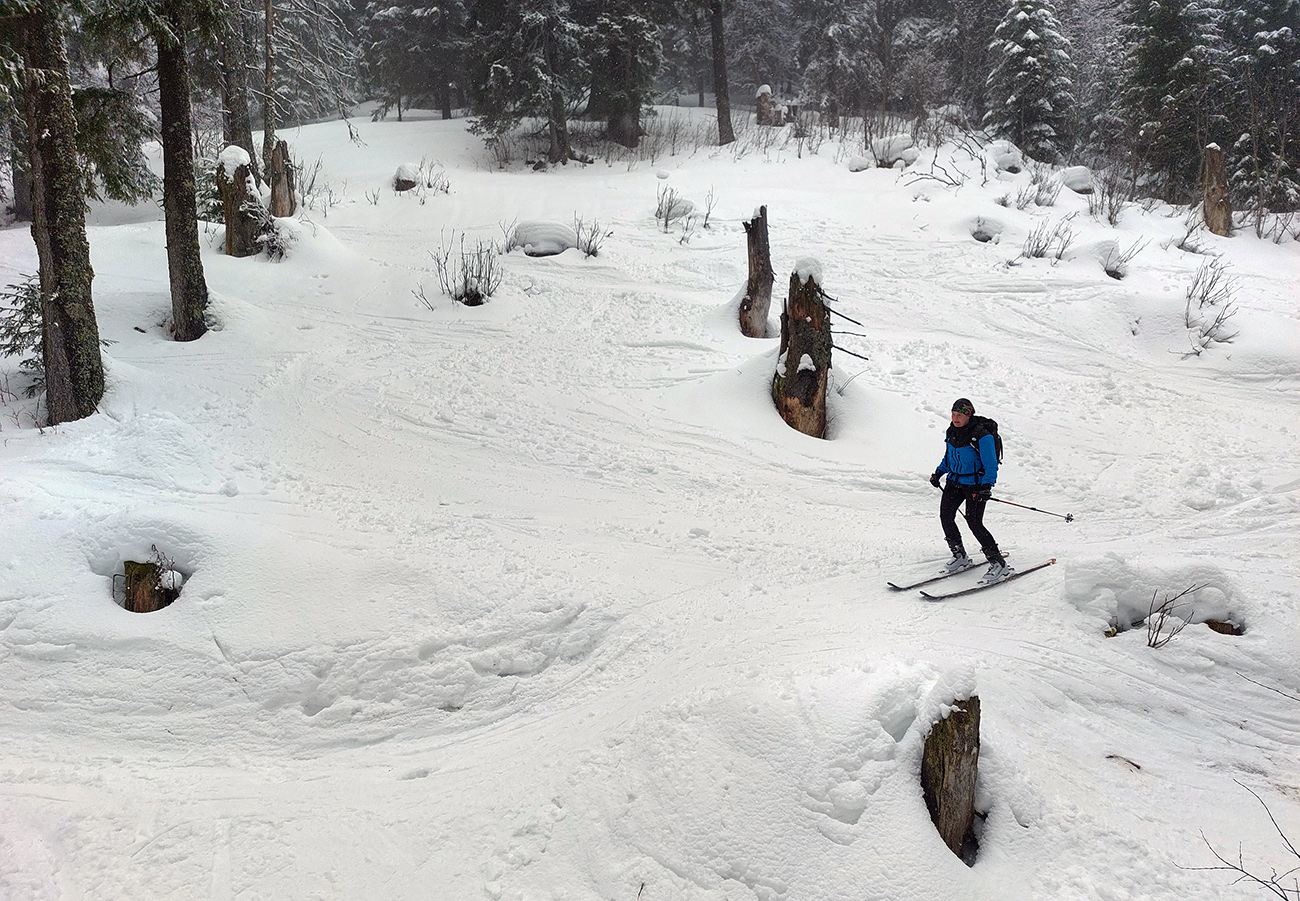 Tak sme smerom dole triafali len od tyče k tyči, ale prekvapivo dobrá lyžba. Po rozchodenom, ale rovnom. A keď sme si už trúfli vrhnúť sa doprava, trafili sme také dobré sňahy, že sa aj ujúkanie ozvalo.