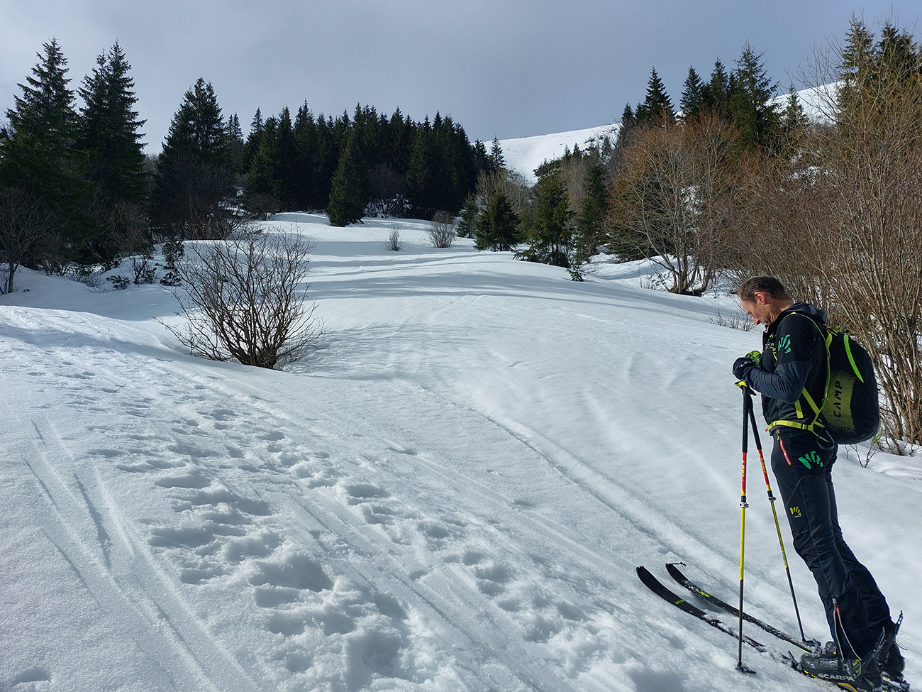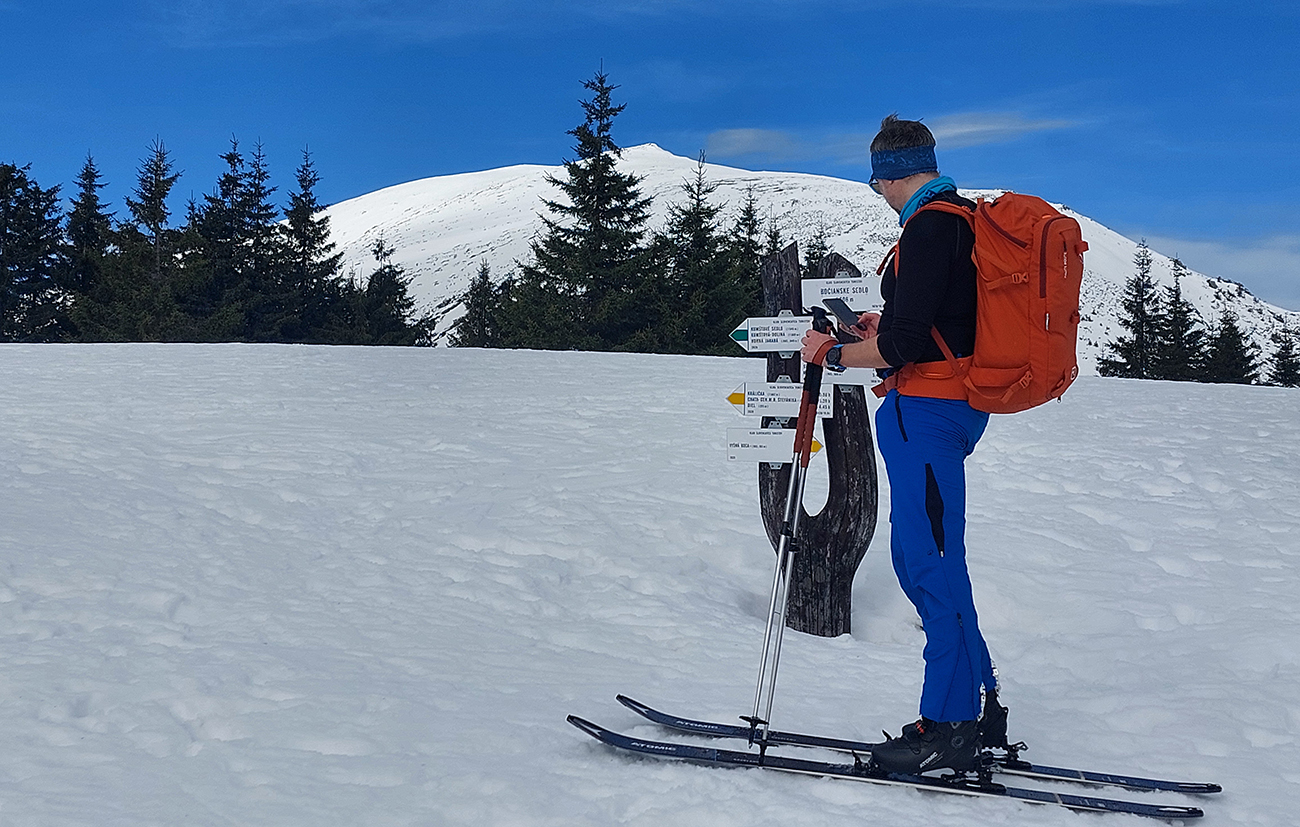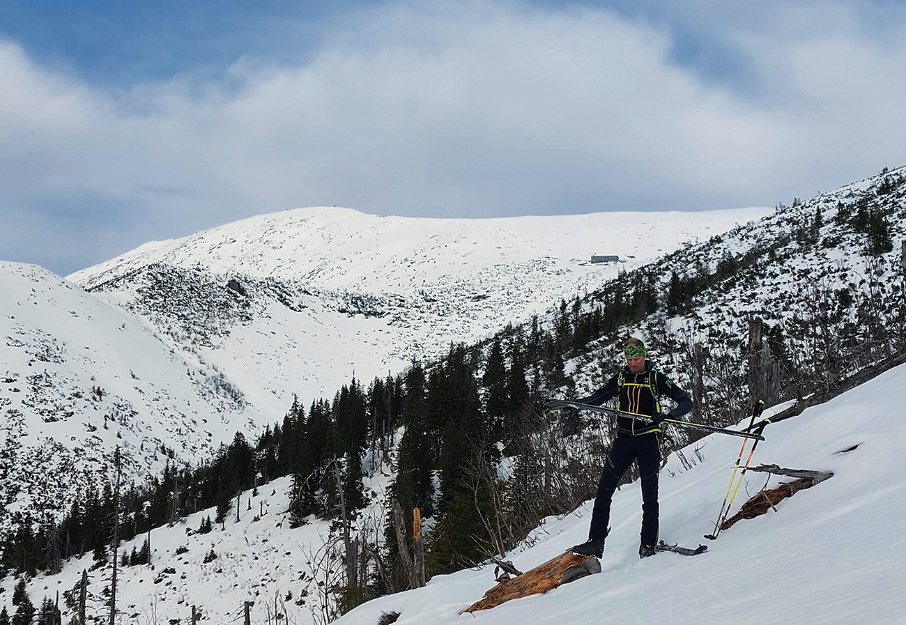 Dve nohy už chytajú akúsi krízu, ale aj čas pokročil, tak zhora šmýkame po hrebeni nazad na Besnú, že teda ešte ten „východný centrál“ dáme a z neho po zelenej značke vylezieme do Kumštového sedla. Zámer čiastočne plníme. Lyžovačka výborná, aj pod Besnou to už zmäklo, len zelenú značku chytáme iba chvíľu na spodku, potom sa smerom hore stráca a stopy vedú inde. Tak traverzujeme priamo na Panskú hoľu a dobre robíme.