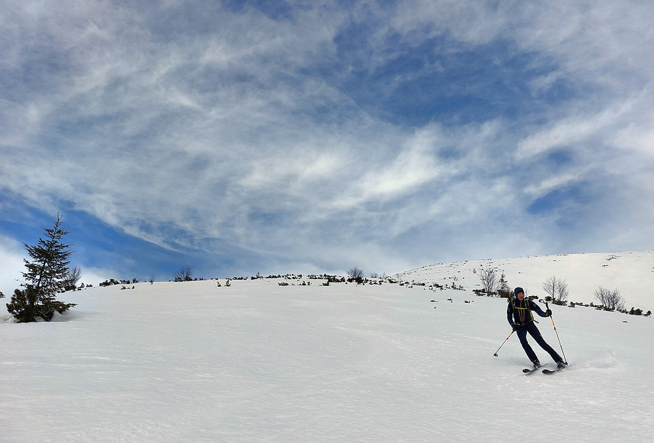Zároveň sa ale otvárajú výhľady a počasie hovorí, že „východný centrál“ Besnej si asi necháme na koniec, tam teraz ešte zima bude, a teda hrkotavo. Ako prvý skúsime hrebienok z vrcholu na juhovýchod. A opláca sa! Hore trochu prituhnutý, nižšie už odmäknutý firn, ale rovný, také oblúky sa dajú rezať, že až!